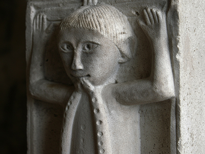 Vi è anche un mascherone, ma merita attenzione la figura di un uomo con due serpi che gli escono dalla bocca. Questo simbolo si trova in posizione opposta all’aquila, motivo che potrebbe ricondurre alla verità contrapposta alla menzogna. Ricordiamo che il serpente che esce dalla bocca è stato indicato da Giotto come il peccato capitale dell’invidia.