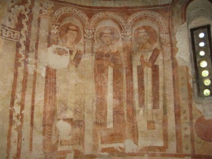 La chiesa presenta tre navate che culminano in tre absidi e i pilastri interni sostengono capitelli con motivi vegetali e zoomorfi (tralci, fogliame, palmette, grappoli, fiori e boccioli, un leone, un uccello, un cane e altre figure). Splendidi gli affreschi del XII secolo nei pressi del ciborio duecentesco dove campeggia un Cristo benedicente in trono che mostra la scritta all’interno del Libro “ego sum primus et ultimus”.
