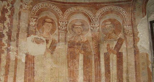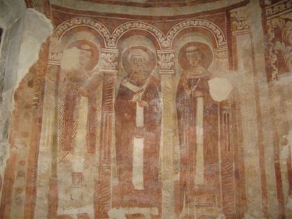 Nella parte inferiore sono visibili alcuni Santi benedettini riconoscibili dalla tonsura e dal Codice della Regola tra le mani. Sono sei, tre per parte, inseriti in nicchie dipinte confinate da arcate colonne e capitelli affrescati. La parte superiore, quasi totalmente perduta, rappresenta Cristo che consegna le chiavi a San Pietro e il rotolo della legge a San Paolo secondo l’antica “traditio legis et clavium”.