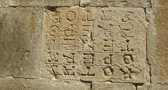 L’elemento più enigmatico dell’edificio, situato a sinistra del portale, è il “Quadrato di Sator”, una scritta palindroma, può infatti essere letta da sinistra a destra e da destra vestro sinistra, dall’alto al basso e dal basso all’alto. Presente anche in altri luoghi antichi, essa cita le parole “rotas opera tenet arepo sator”.