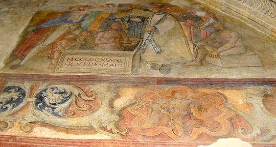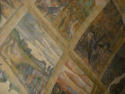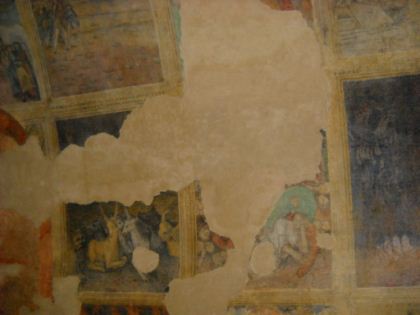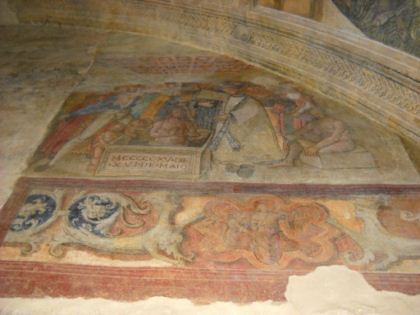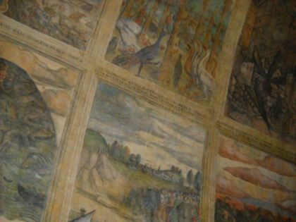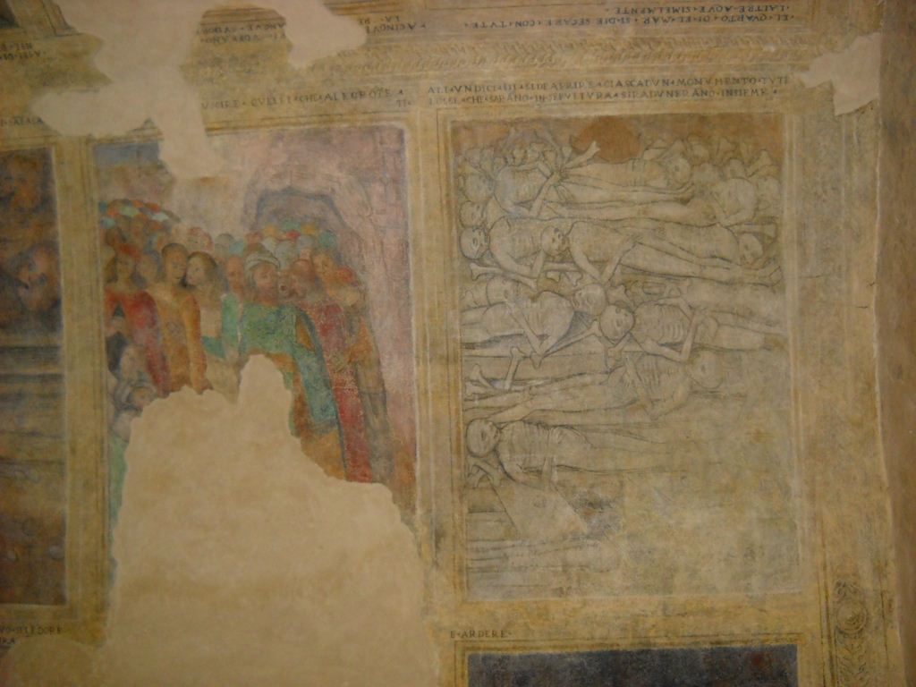 Nel cosiddetto “Cappellone” è presente un ciclo di affreschi tardomedievali sulle scene dell’Apocalisse tratte in massima parte dai Vangeli Apocrifi. E’ l’intera rappresentazione a farci interrogare su quanto una sequenza della fine del mondo sia così realistica. In 14 riquadri non si incontrano angeli con in mano trombe, cavalieri dell’Apocalisse, mostri a 7 teste.