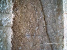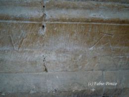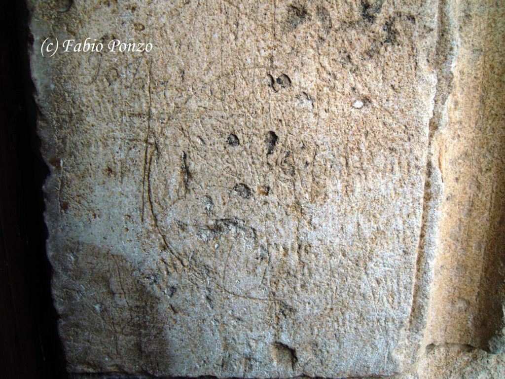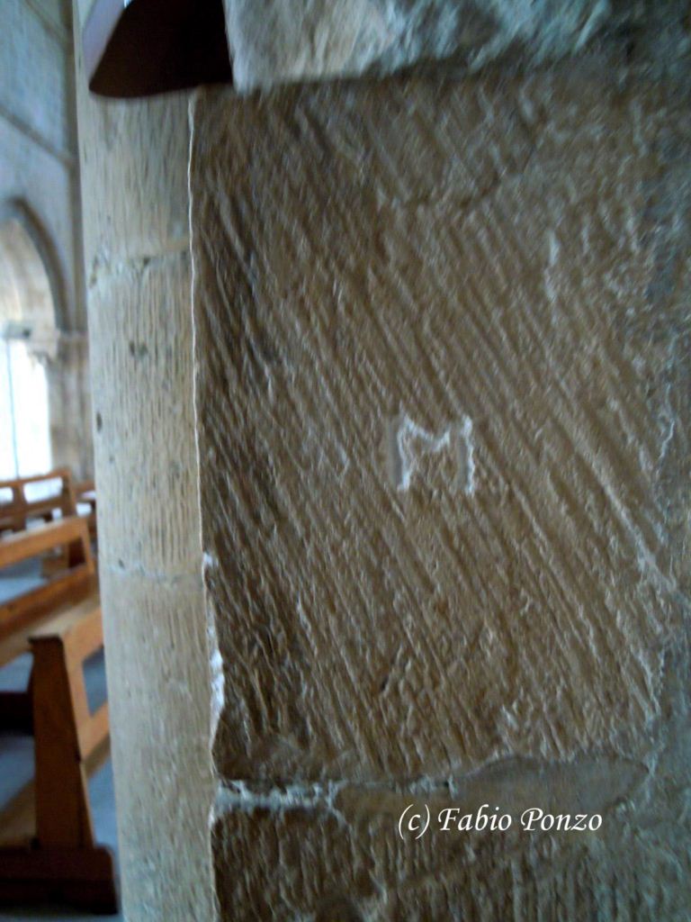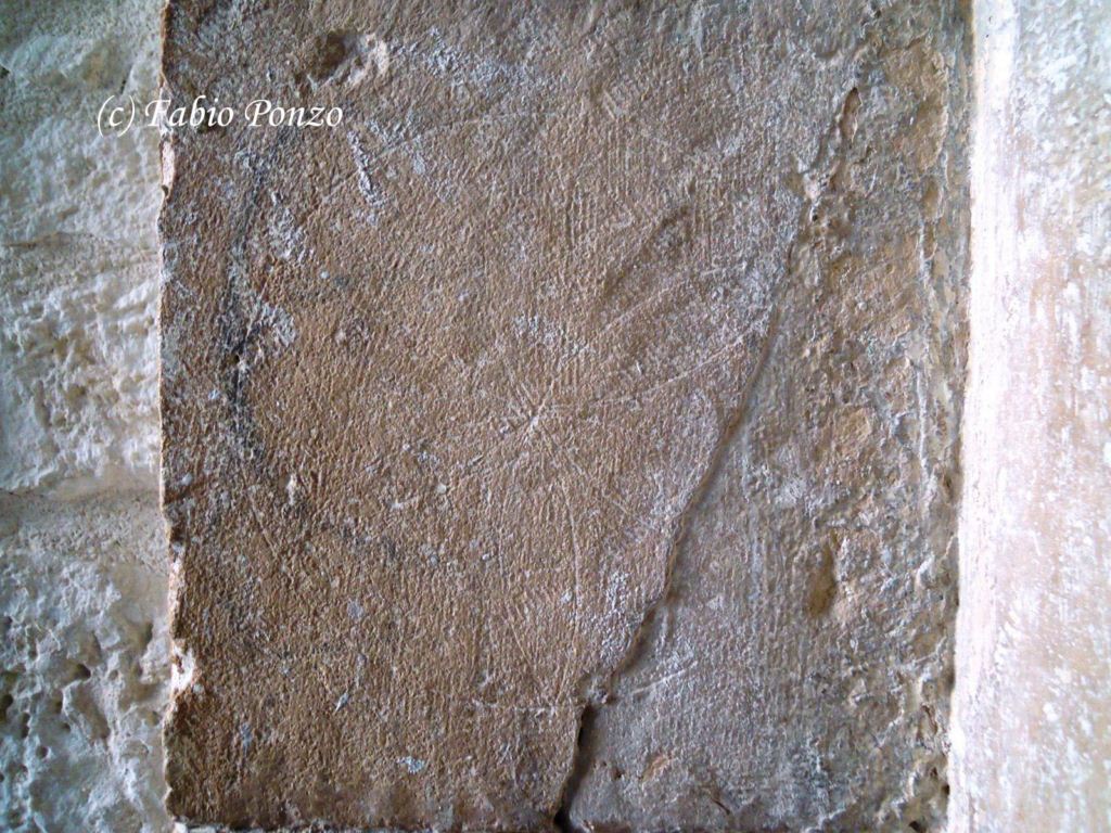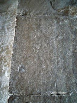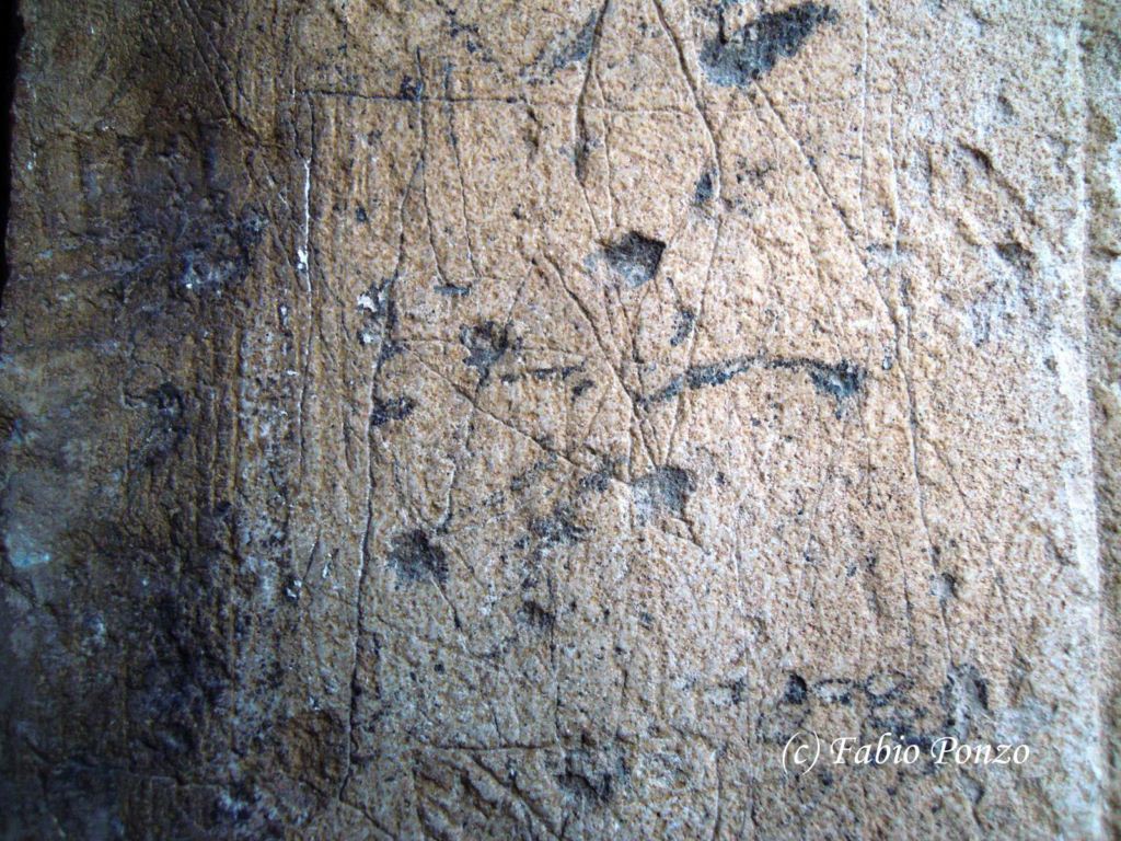 E’ incisa una intricata griglia, presente in alcune chiese, il significato è ancora ignoto. C’è chi la attribuisce alla piattaforma di un gioco, chi la avvicina alla scacchiera e quindi ai Templari