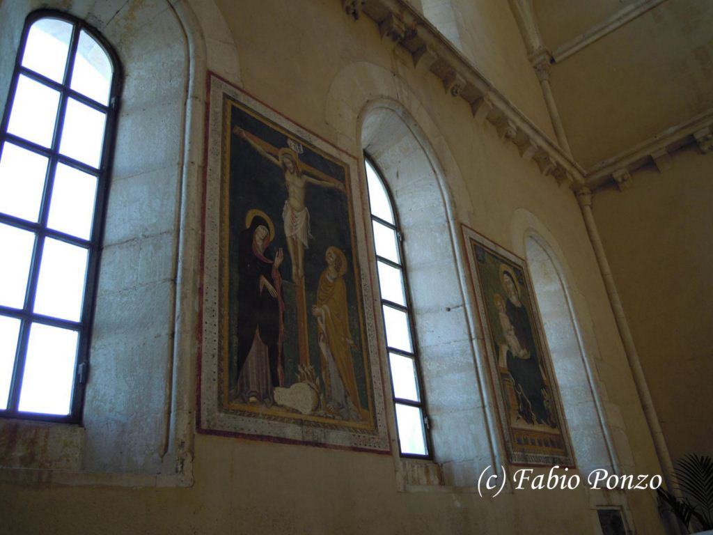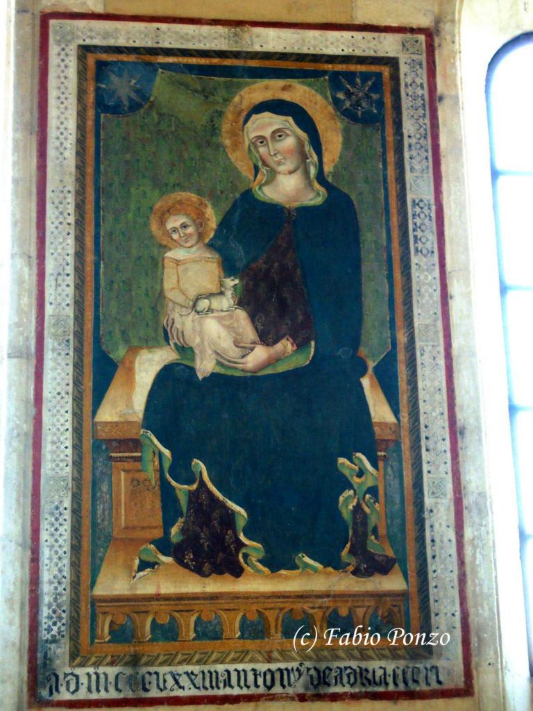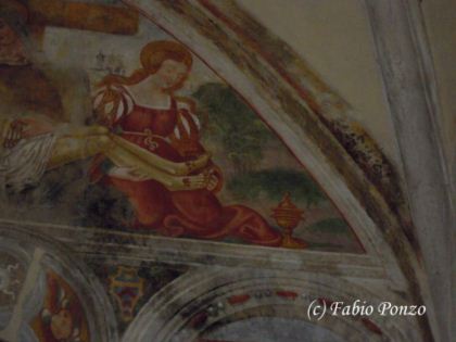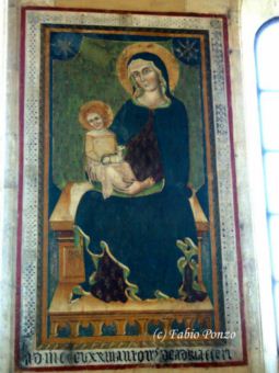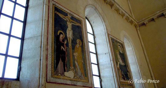 Nell’abside sono presenti 3 dipinti, a partire da sinistra abbiamo una Santa coronata, probabilmente Santa Caterina d’Alessandria con in mano un libro chiuso, con l’altra un fiore e con dinnanzi a lei un frate cistercense inchinato. Di seguito incontriamo una crocifissione con la Madonna e San Giovanni. L’ultimo a destra rappresenta una vergine in trono con Gesù bambino, che tiene in mano un cagnolino bianco. Il dipinto è del 1377 ad opera di Antonio Martini di Atri, l’animale è metafora della fedeltà e rimane una presenza inconsueta nelle mani di Gesù.