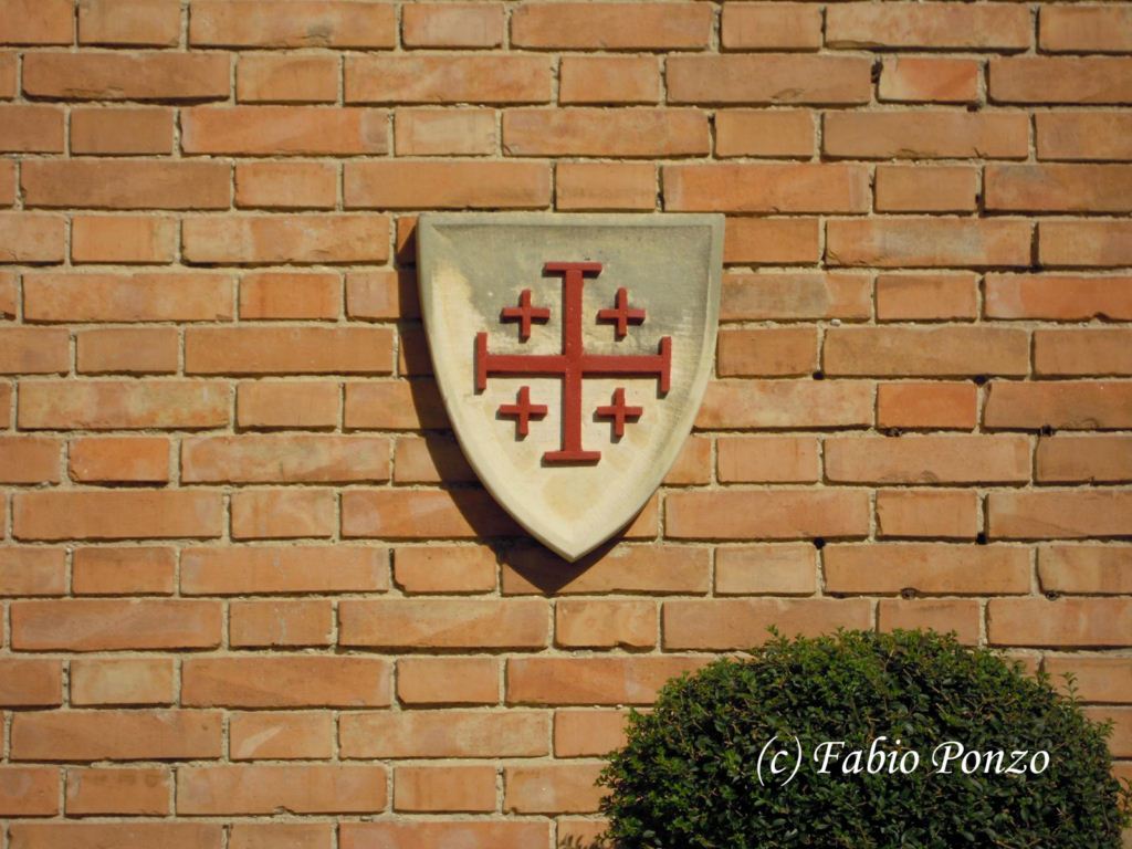 “Il simbolo raffigurato a sinistra è più volte presente dentro e fuori l’abbazia, in diverse varianti. Esternamente, lo troviamo su dei conci inseriti al centro dei due costoloni che affiancano i portale d’ingresso. Quello di sinistra presenta il “ricciolo” irto di punte, che si avvolge verso sinistra, come nello schema che abbiamo qui ricostruito, mentre quello di destra lo ha doppio (quasi in forma di Tau), e presenta una specie di “S” avvolta sullo stelo centrale (un serpente?). Un altro esemplare si trova su una pietra a sagoma triangolare posta nel giardino. Presenta sempre i tre steli ritti ma il “ricciolo” superiore, semplice e spiraliforme, riavvolge verso destra. Lo ritroviamo anche all’interno, su una pietra pavimentale inserita davanti all’altare: esso presenta la doppia appendice e compare insieme ad altre insegne vescovili: il bastone pastorale e la mitria. Un quinto simbolo, del tutto simile a quello sulla pietra triangolare esterna, compare sull’architrave di una porta, evidenziato con della tintura rossa. Si tratta, con tutta probabilità, di un emblema intrinsecamente legato all’abbazia, affine a quello che compare in più punti dell’Abbazia di Morimondo, presso Milano, di cui abbiamo parlato nela scheda apposita.”