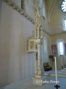 Alle spalle del candelabro, appoggiato al muro ha la sua presenza un bellissimo tabernacolo in pietra (fine XIII secolo  inizio XIV), l’unico esempio di questa tipologia nella regione.