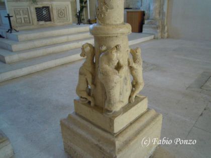 E’ inconsueto vedere questi animali come simboli negativi, perchè normalmente rappresentavano qualcosa di positivo legato alla forza, alla nobiltà e alla fedeltà. Sarebbero realmente, secondo le interpretazioni date dagli studiosi, una minaccia al bene? Perchè dunque scolpire leoni e cani e non più semplicemente draghi e lupi? A mio avviso, più che minacciare la base della colonna, potrebbero sostenerla con il loro vigore e la loro energia. Dopotutto la casualità ha voluto che in braccio a Gesù nel presbiterio ci sia proprio un cagnolino.