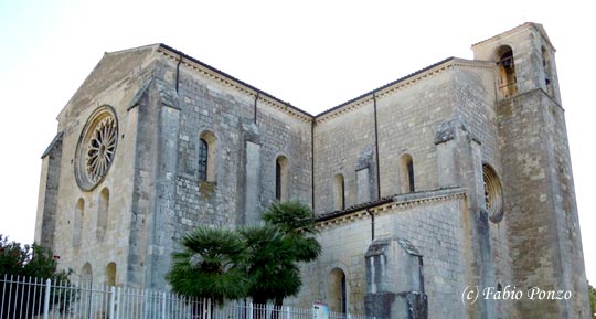 La facciata è costituita da un’alternanza di mattoni rossi con la pietra chiara locale a causa del restauro degli ultimi anni. Presenta una pianta quasi centrale con le navate laterali che sostengono la volta e con nella navata centrale la presenza di un ricco tabernacolo e un particolare candelabro. Le arcate a tutto sesto richiamano le strutture delle abbazie di Casamari e Fossanova; come Casamari, ad esempio, presenta 5 finestre sul fondo della parte absidale rettangolare, la parete della chiesa più antica, e due coppie di cappelle che si affacciano sul transetto.