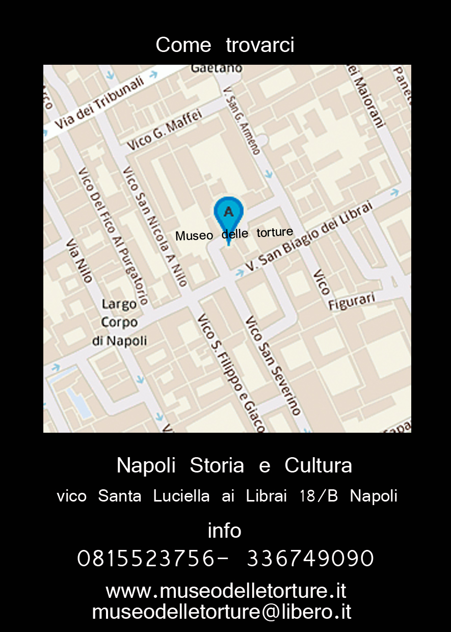 Luogo: Il Museo delle torture è a cura dell’Associazione “Napoli Storia e Cultura“ – Vico Santa Luciella ai Librai 18/B – 80138 Napoli