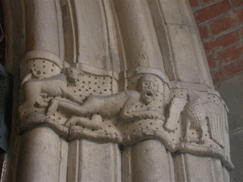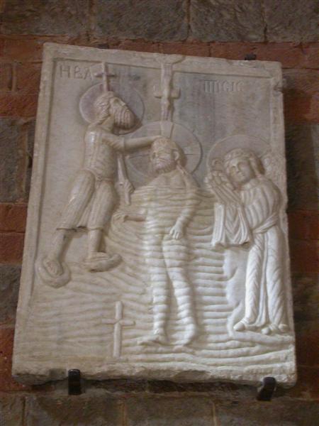 Nella chiesa è conservata una vasca battesimale del XII secolo, con decorazione di tipo architettonico a colonne e ad archi incrociati. E’ possibile trovare anche una lastra scolpita a bassorilievo che raffigura il Battesimo di Gesù. La composizione della scena, con il Battista a sinistra in piedi su una roccia e Gesù immerso nell’acqua su cui scende lo Sipirito Santo sotto forma di Colomba e l’angelo a destra è di derivazione bizantina e verrà mantenuta in seguito nelle raffigurazioni del battesimo di Gesù di area ortodossa, in particolare nelle icone russe.