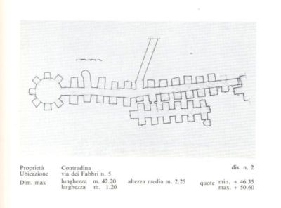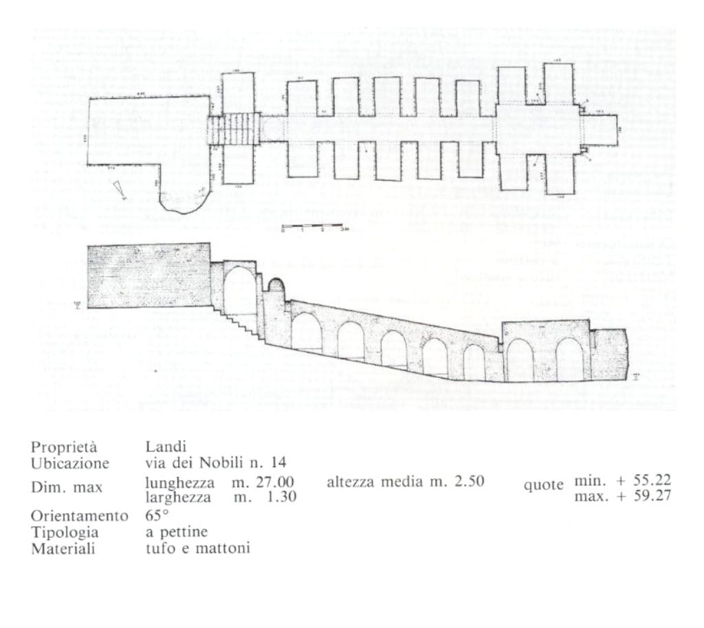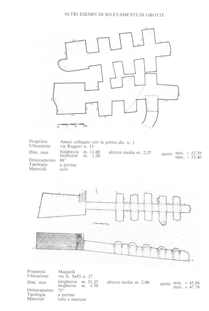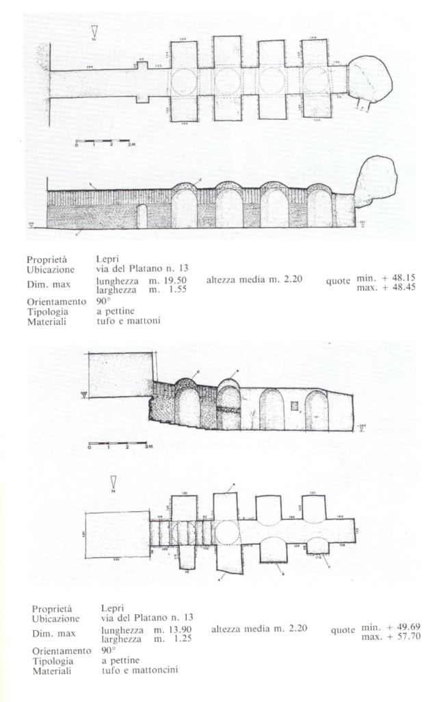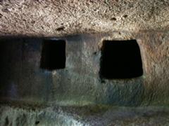 Sono state censite due tipologie differenti , la prima consiste in corridoi di 1,20 metri di larghezza e 2 metri di altezza, con nicchie laterali a “pettine” distribuite in sequenze regolari; la seconda comprende stanze a pianta rettangolare o circolare con colonne e coperture a cupola o a volta.