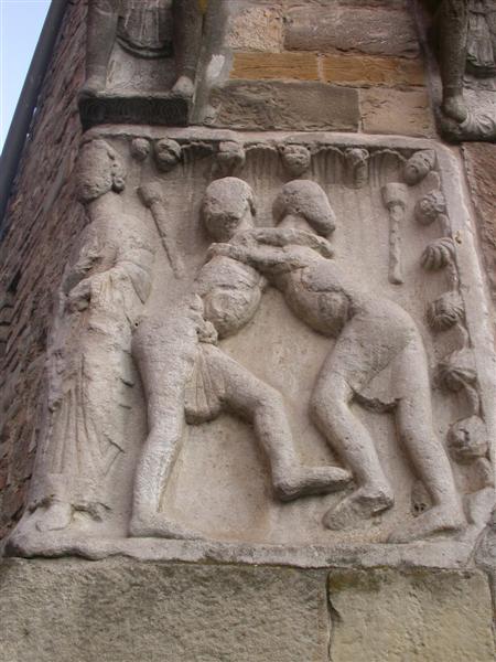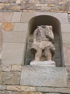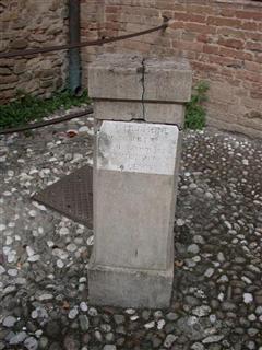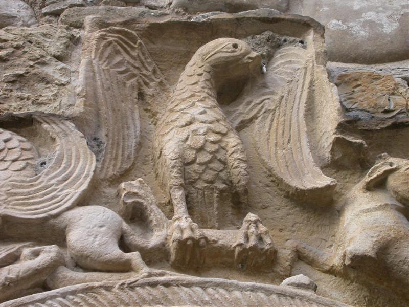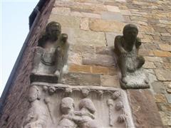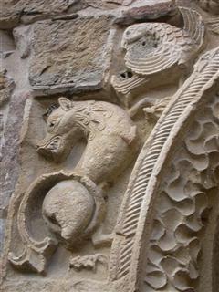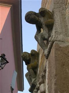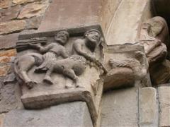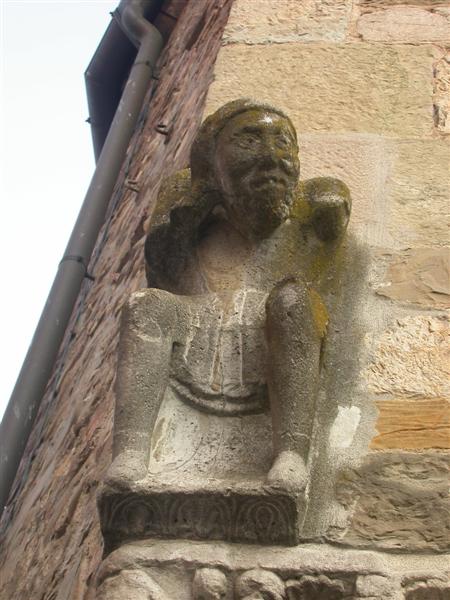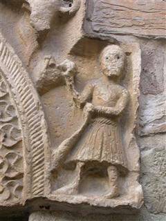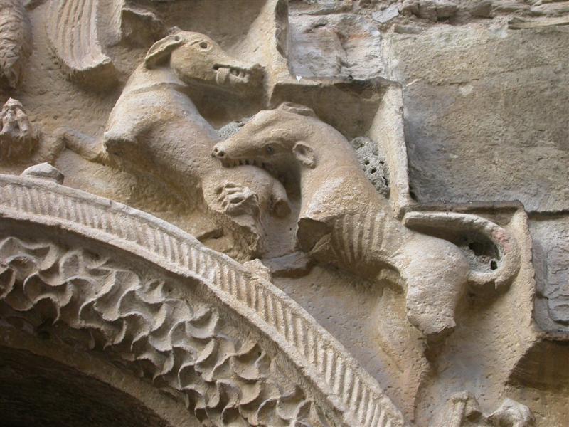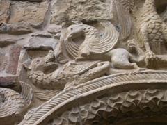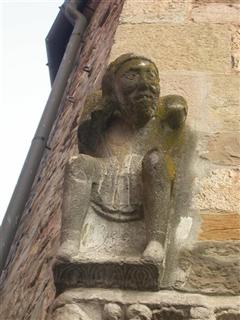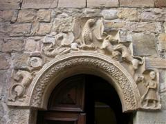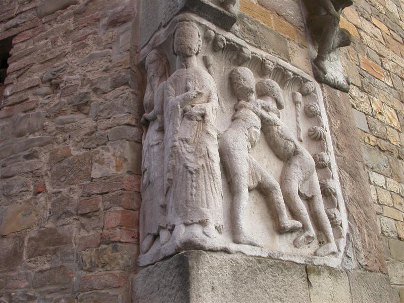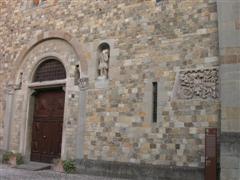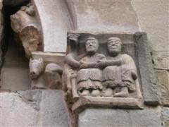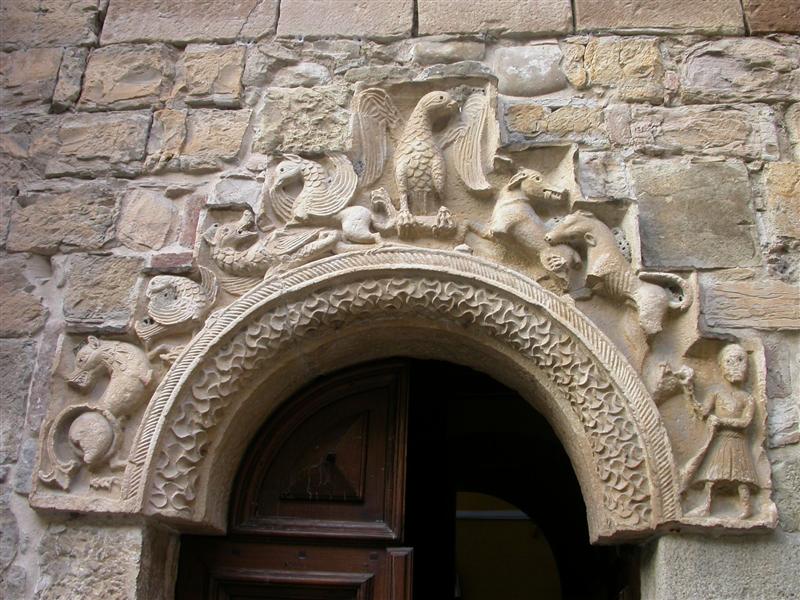 La statua del pellegrino a fianco del portale indica la strada per Roma (simboleggiata dalle chiavi di San Pietro appese alla cintura) come segnale per chi stava percorrendo la Via Francigena. A volte si utilizzava questo curioso “cartello stradale”, riportato anche dalla cattedrale di Fidenza, in cui un pellegrino-San Pietro indicava, la strada per andare a Roma… come non fidarsi delle indicazioni di Pietro?