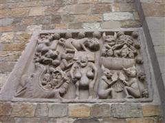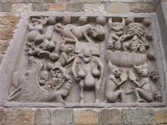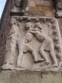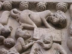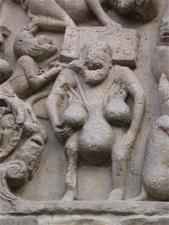 FORNOVO (PR) – CHIESA DI S. MARIA ASSUNTA / L’uomo mostruoso al centro della raffigurazione, nostro protagonista perché cattura il primo sguardo, porta con sé tre grosse sacche che disposte in quel modo mostrano un corpo quasi deforme, come se fossero delle escrescenze di esso.