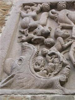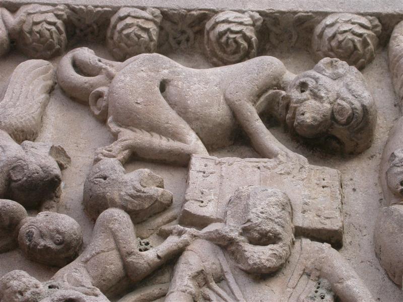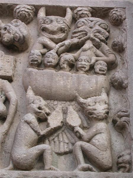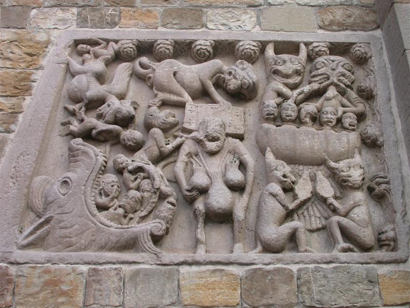 Questa spaventosa scena, che non lascia indifferente nemmeno noi uomini del XX secolo (possiamo dunque immaginare l’effetto spaventoso che poteva suscitare alla gente dell’epoca), raffigura l’inferno in un suo aspetto molto preciso. L’uomo mostruoso al centro della raffigurazione, nostro protagonista perché cattura il primo sguardo, porta con sé tre grosse sacche che disposte in quel modo mostrano un corpo quasi deforme, come se fossero delle escrescenze di esso. In verità si tratta di un AVARO con i sui beni. I preti che hanno deciso di realizzare una simile “decorazione”, furbescamente hanno scelto la tragica fine di un avaro nell’oltretomba, cosicché i contadini, anche se poveri, per paura di peccare di avarizia, avrebbero, alla sola vista dell’immagine, lasciato tutti i propri beni all’istituzione ecclesiastica. Insomma… Nulla è lasciato al caso. Diciamo che tra tutte le pene infernali si è voluta scegliere proprio l’avarizia… chissà come mai…