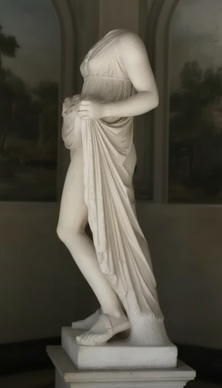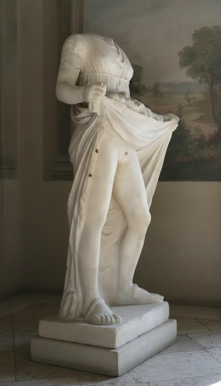 “… La statua, databile nel 150 – 175 d.C. ca. – scrive la dottoressa van Kampen, Direttrice del locale Museo – considerando la sua grandezza, originariamente probabilmente raffigurava una statua di culto e dovrebbe provenire da un tempio ionico sul pianoro di Veio (forse da collegare al toponimo Campetti), frutto degli scavi del periodo 1661- 1669 del Cardinale, descritti da Pietro Santi Bartoli. La prima di una coppia di Dij degli Orti portava frutti come segno di fertilità, simboleggiata anche dalla connotazione sessuale maschile e femminile. La statua è stata oggetto di restauri seicenteschi probabilmente da attribuire a Baldassarre Mari – e così sappiamo finalmente chi ha messo mano alle prime cure, ”di pronto soccorso”, alle statue – come testimonia la descrizione degli interventi pagati il 19 novembre 1662, la quale calza alla perfezione quanto oggi conservato e quanto mancante, con le grappe degli interventi dell’epoca come testimonianza…”.