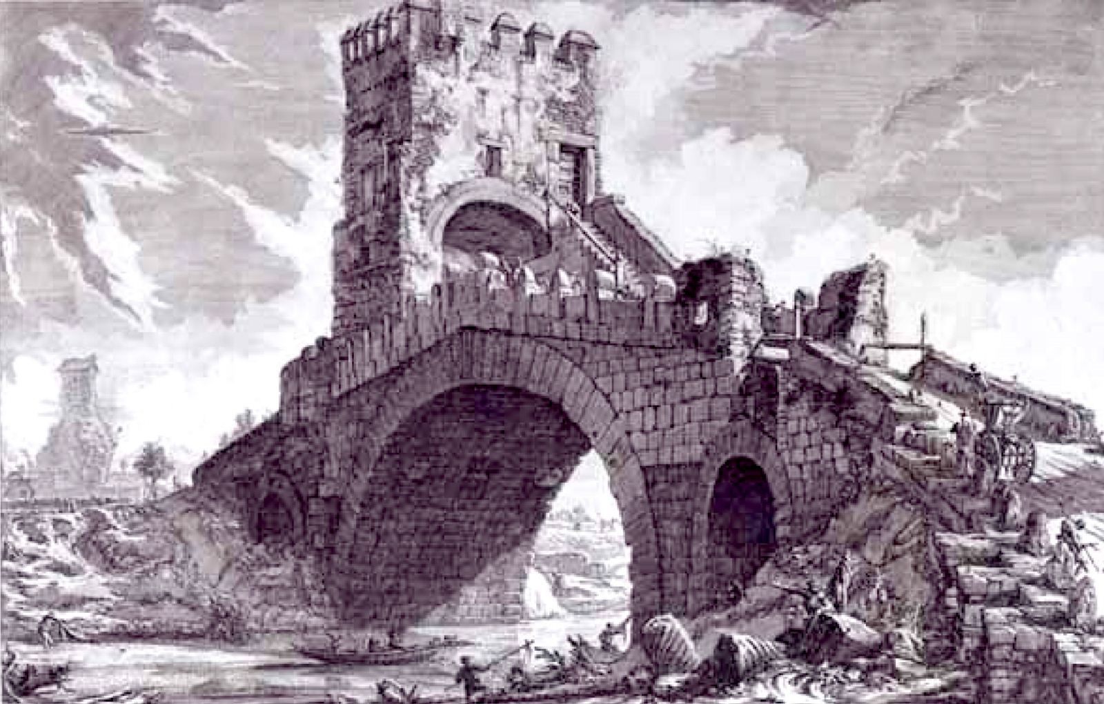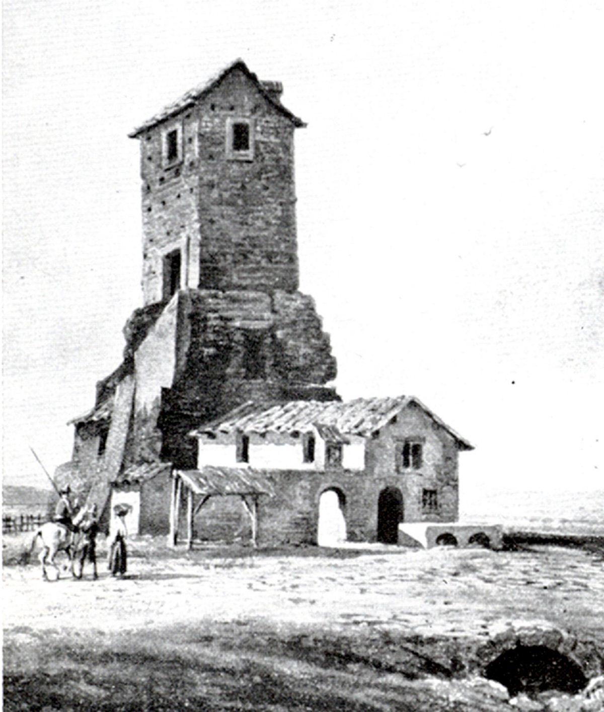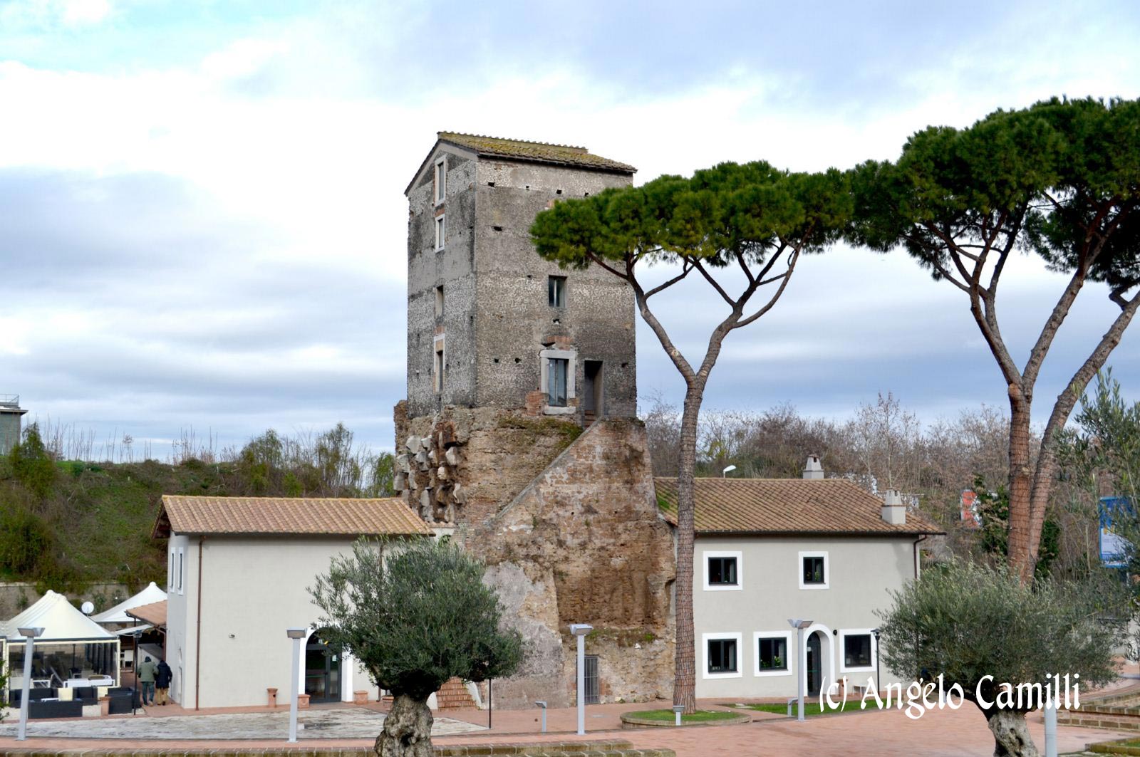 La struttura, trasformata secondo lo storico latino Procopio in torre di guardia ne 537 d.C. (denominata Torre del Caricatore), è alta 22 metri ed ha le finestre su quattro piani. Come testimonia la rappresentazione del Catasto Alessandrino del XVII sec., la copertura doveva essere costituita in origine da una struttura con volta a botte arricchita da merli. Nel 1396 è ricordata in un atto di vendita di un nobile romano (Buzio Ranieri di Cola) del rione Colonna e nel 1539 divenne proprietà della famiglia Crescenzi. Indagini più recenti hanno constatato che i terreni del sito sarebbero stati di proprietà del Monastero di S. Silvestro di Capite e successivamente dell’Ospedale di S.Giacomo degli Incurabili. Alcune rappresentazioni iconografiche del XVII sec. attestano che alla torre fu addossato un casale che ha conservato a lungo la funzione di osteria. Lungo le strade maestre, alla confluenza con altre vie, erano presenti molte osterie di posta utilizzate come locande, spaccio, cambio cavalli.