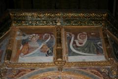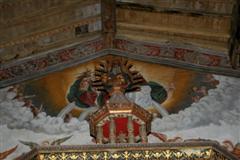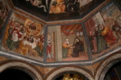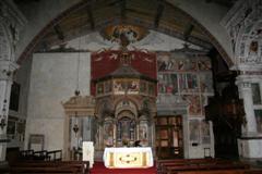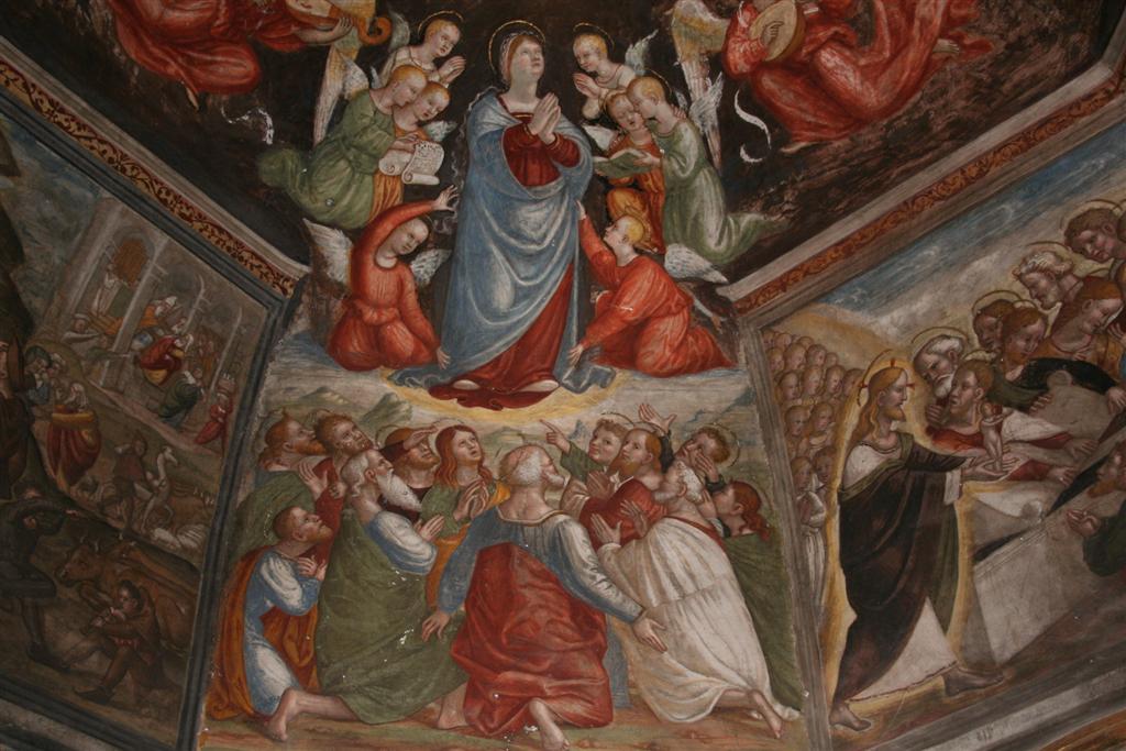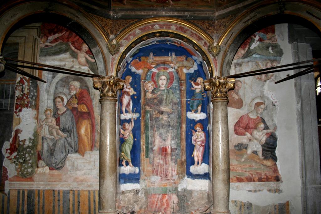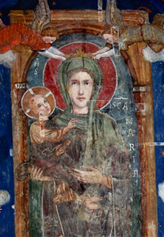 Sopra l’altare invece vi è l’affresco miracoloso della Madonna con Bambino; Maria è coronata da due angeli e Gesù tiene in mano il Vangelo. Vi è la scritta: “SCA MARIA e IHS”. Alcuni studi lo hanno datato al 1100.