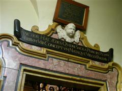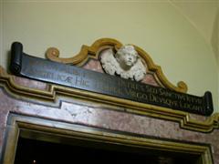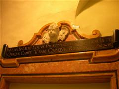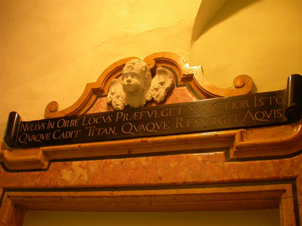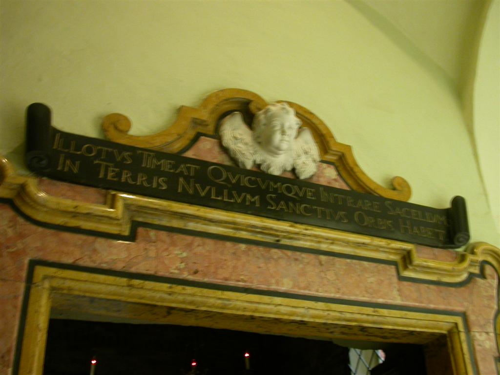 primo portale di sinistra (ingresso): ILLOTUS TIMEAT QUICUMQUE INTRARE SACELLUM / IN TERRIS NULLUS SANCTIUS ORBIS HABET (Coloro che sono immondi abbiano timore di entrare nel santuario di cui nessuno possiede nulla di più sacro al mondo);
