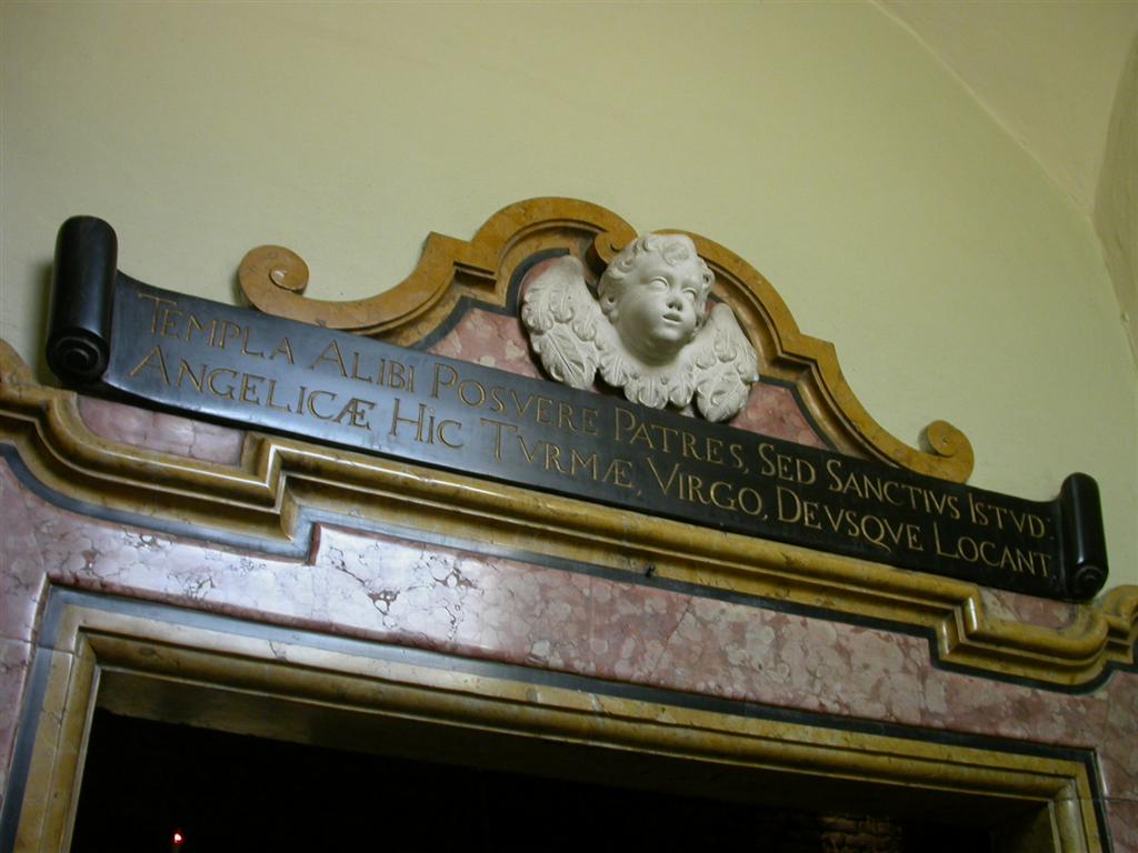 primo portale di destra (ingresso): TEMPLA ALIBI POSUERE PATRES SED SANCTIUS ISTUD / ANGELICAE HIC TURMAE, VIRGO, DEUSQUE LOCANT (Gli antenati posero altrove i templi, ma le schiere angeliche, la Vergine e Dio pongono qui questo, così sacro);