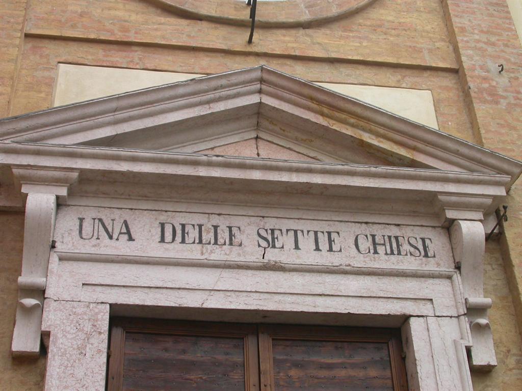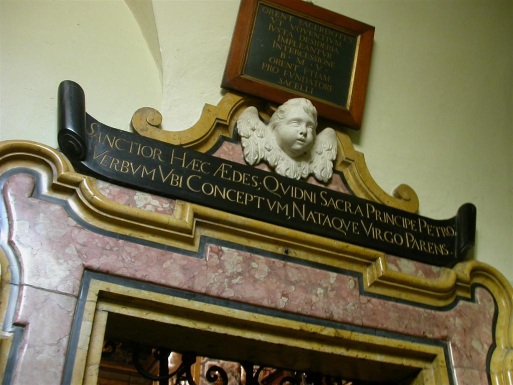secondo portale di destra(con cancello): SANCTIOR HAEC AEDES QUIDNI SACRA PRINCIPE PETRO / VERBUM UBI CONCEPTUM, NATAQUE VIRGO PARENS (Questa casa, dove il Verbo fu concepito e dove nacque la Vergine sua madre, è così santa che non può non essere consacrata dal pontefice).