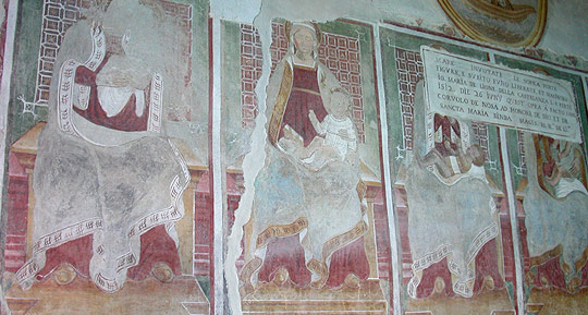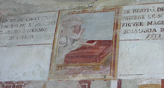 Ma è l’interno che merita la nostra attenzione, perché nasconde una sorta di enigmatica pittura realizzata nel 1512 da GIOVANNI MARIA LEONI DELLA CASTELLANA (uniche sue opere). Come prima anomalia abbiamo sulla parete di sinistra, la Madonna con Bambino ripetuta ben sette volte. Gli affreschi sono leggermente differenti ma il tema è sempre lo stesso, come uguale è la posizione dei personaggi, ripetuto in sequenza, uno dopo l’altro per ben sette volte. Insolito, enigmatico, raro e senza una particolare spiegazione a parte quella numerologica.