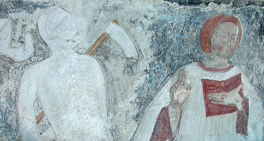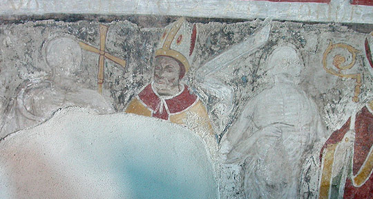 NOSATE (MI) – S. MARIA IN BINDA / Appena sotto i 7 affreschi è rappresentata una rara pittura di DANZA MACABRA, del ballo della morte con alcuni uomini dell’allora società, persone potenti, anche ecclesiastici, a riprova che la Morte non risparmia nessuno, neppure colui che ai nostri occhi ci può apparire “immortale”.