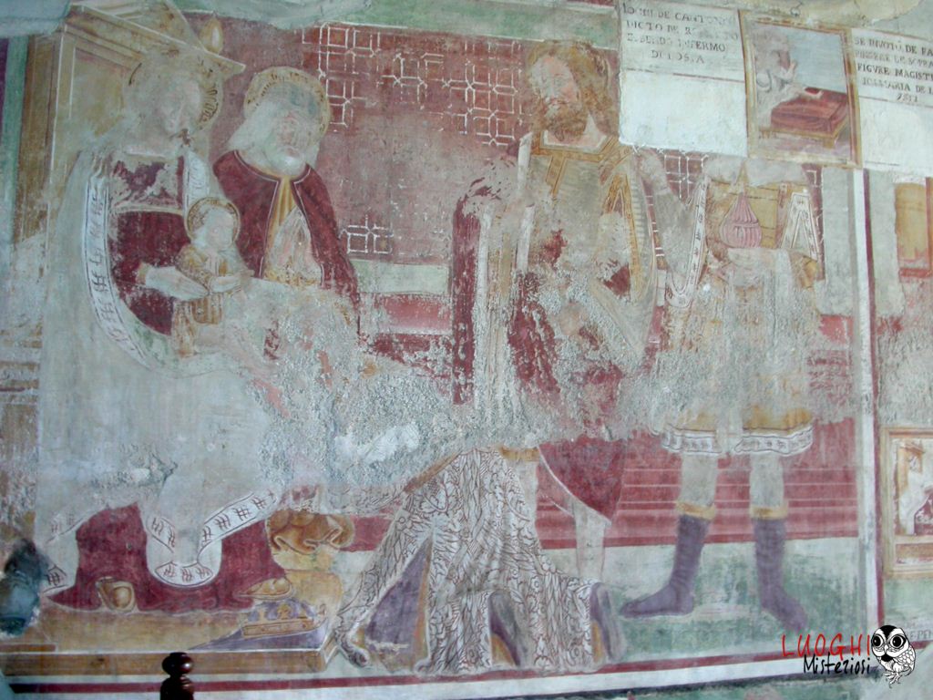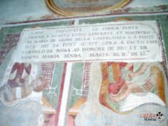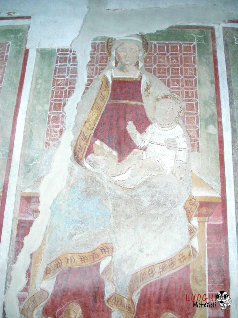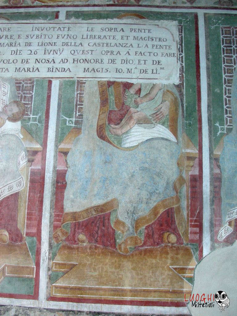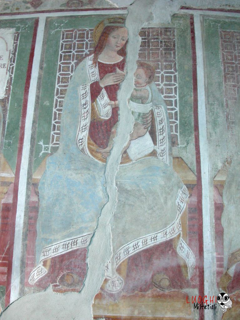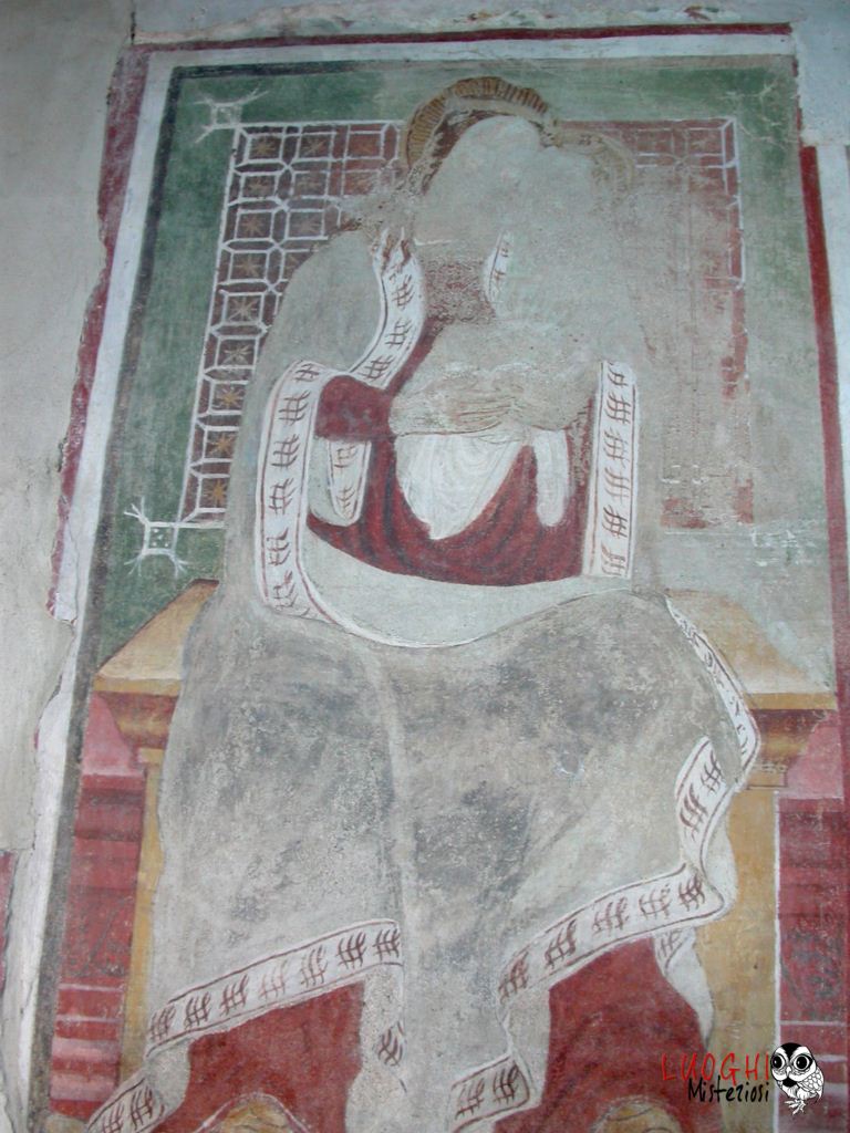 Ma è l’interno che merita la nostra attenzione, perché nasconde una sorta di enigmatica pittura realizzata nel 1512 da GIOVANNI MARIA LEONI DELLA CASTELLANA (uniche sue opere). Come prima anomalia abbiamo sulla parete di sinistra, la Madonna con Bambino ripetuta ben sette volte. Gli affreschi sono leggermente differenti ma il tema è sempre lo stesso, come uguale è la posizione dei personaggi, ripetuto in sequenza, uno dopo l’altro per ben sette volte. Insolito, enigmatico, raro e senza una particolare spiegazione a parte quella numerologica.