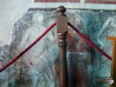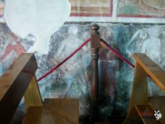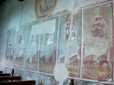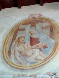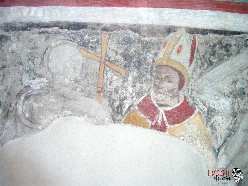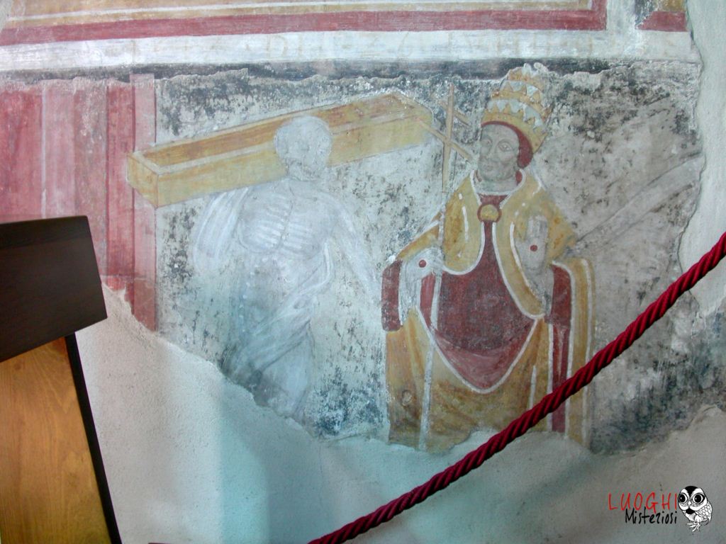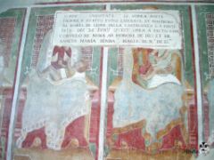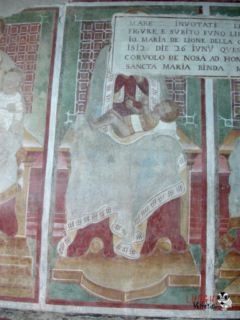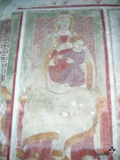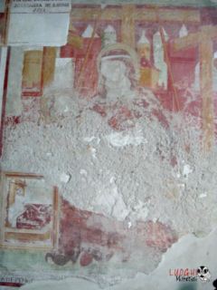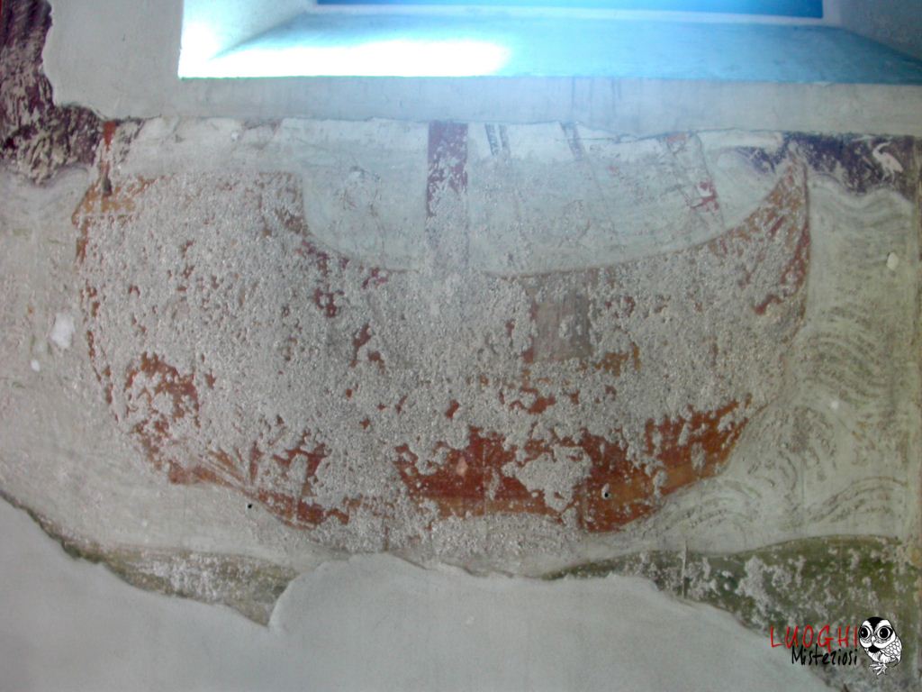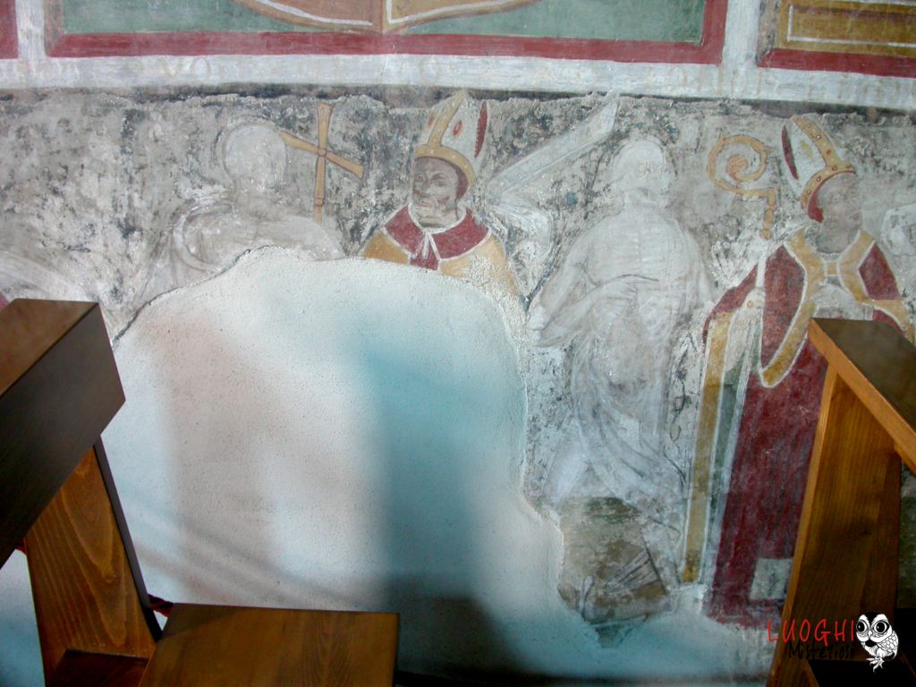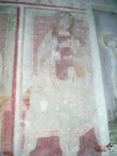 Ma è l’interno che merita la nostra attenzione, perché nasconde una sorta di enigmatica pittura realizzata nel 1512 da GIOVANNI MARIA LEONI DELLA CASTELLANA (uniche sue opere). Come prima anomalia abbiamo sulla parete di sinistra, la Madonna con Bambino ripetuta ben sette volte. Gli affreschi sono leggermente differenti ma il tema è sempre lo stesso, come uguale è la posizione dei personaggi, ripetuto in sequenza, uno dopo l’altro per ben sette volte. Insolito, enigmatico, raro e senza una particolare spiegazione a parte quella numerologica.