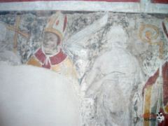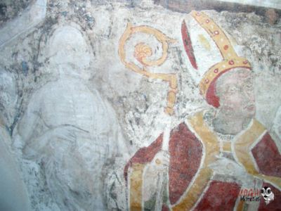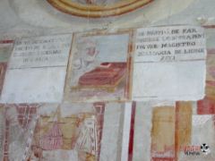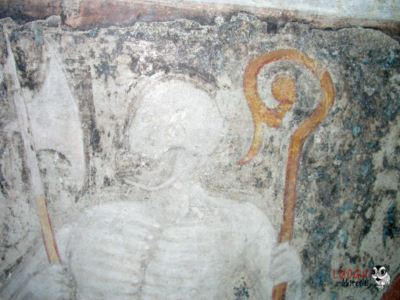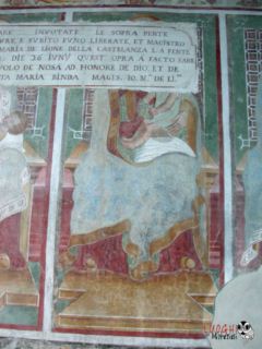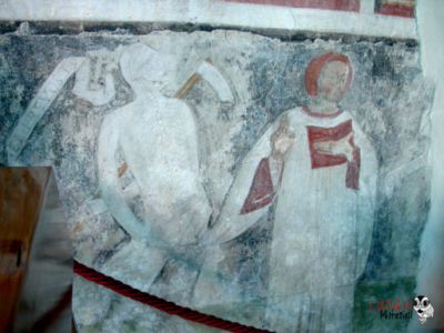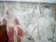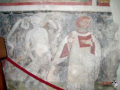 NOSATE (MI) – S. MARIA IN BINDA / Appena sotto i 7 affreschi è rappresentata una rara pittura di DANZA MACABRA, del ballo della morte con alcuni uomini dell’allora società, persone potenti, anche ecclesiastici, a riprova che la Morte non risparmia nessuno, neppure colui che ai nostri occhi ci può apparire “immortale”.