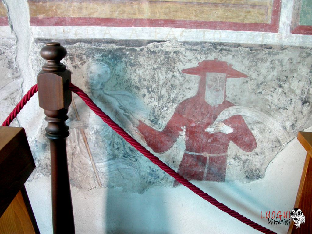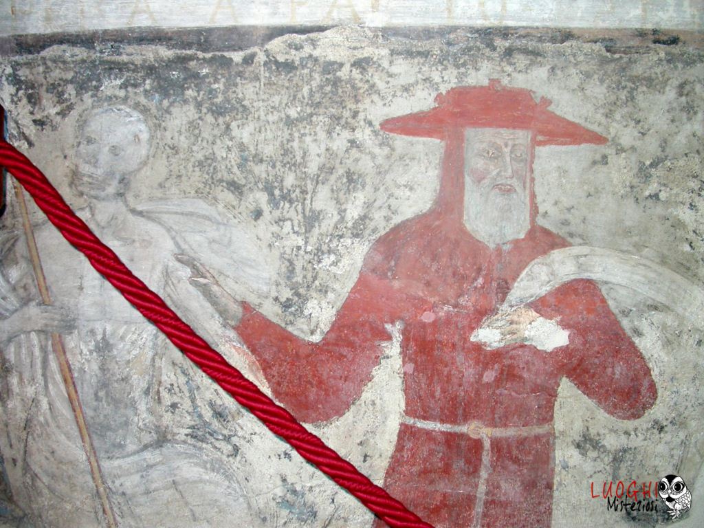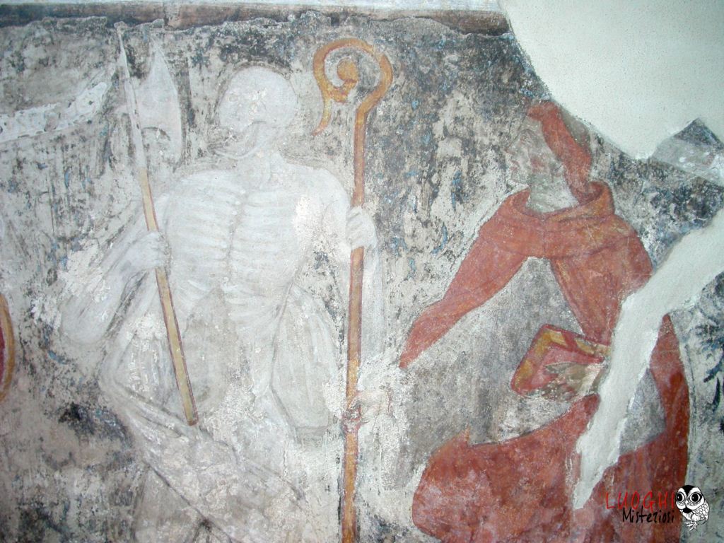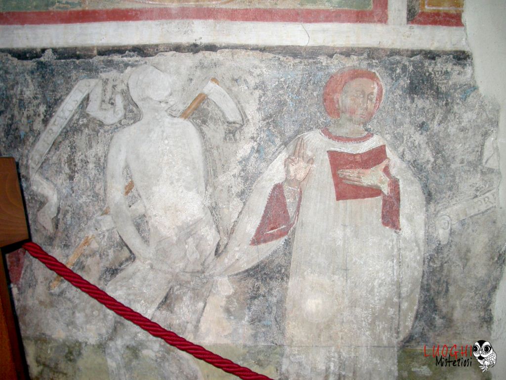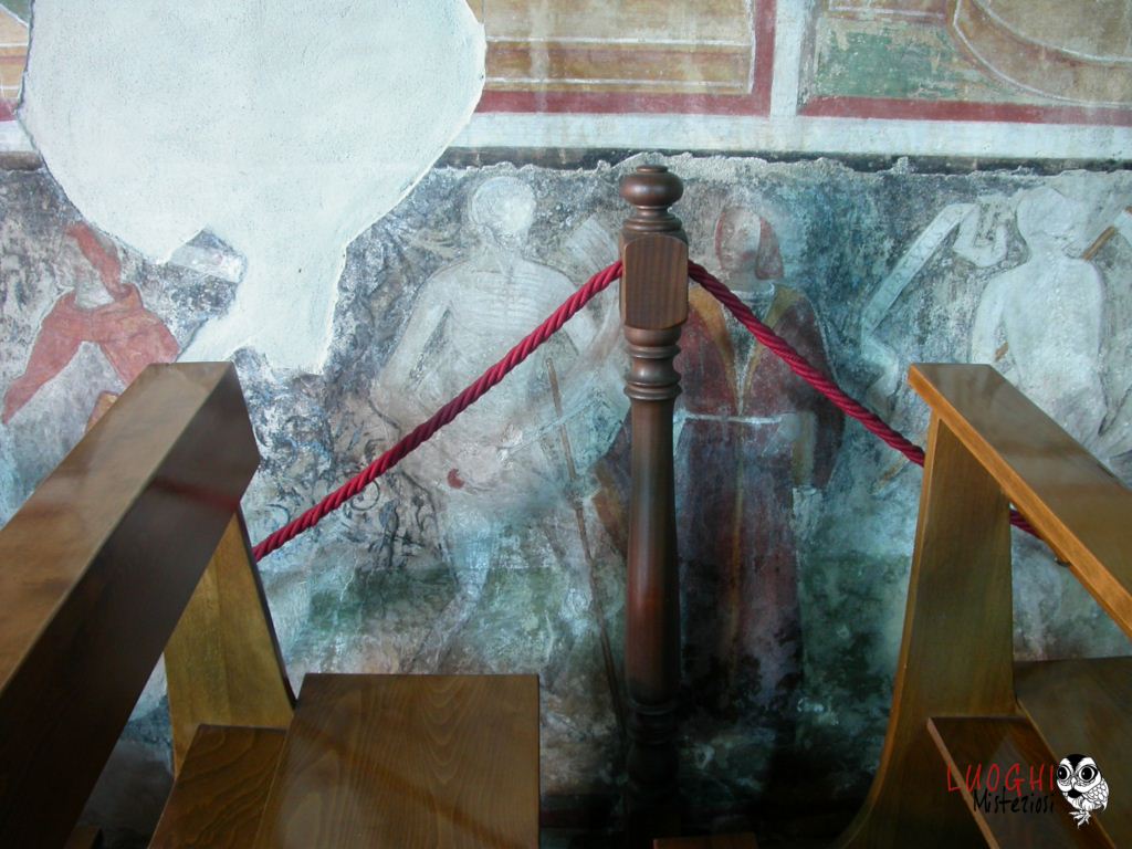 Appena sotto i 7 affreschi è rappresentata una rara pittura di DANZA MACABRA, del ballo della morte con alcuni uomini dell’allora società, persone potenti, anche ecclesiastici, a riprova che la Morte non risparmia nessuno, neppure colui che ai nostri occhi ci può apparire “immortale”.