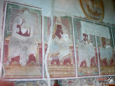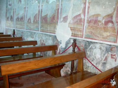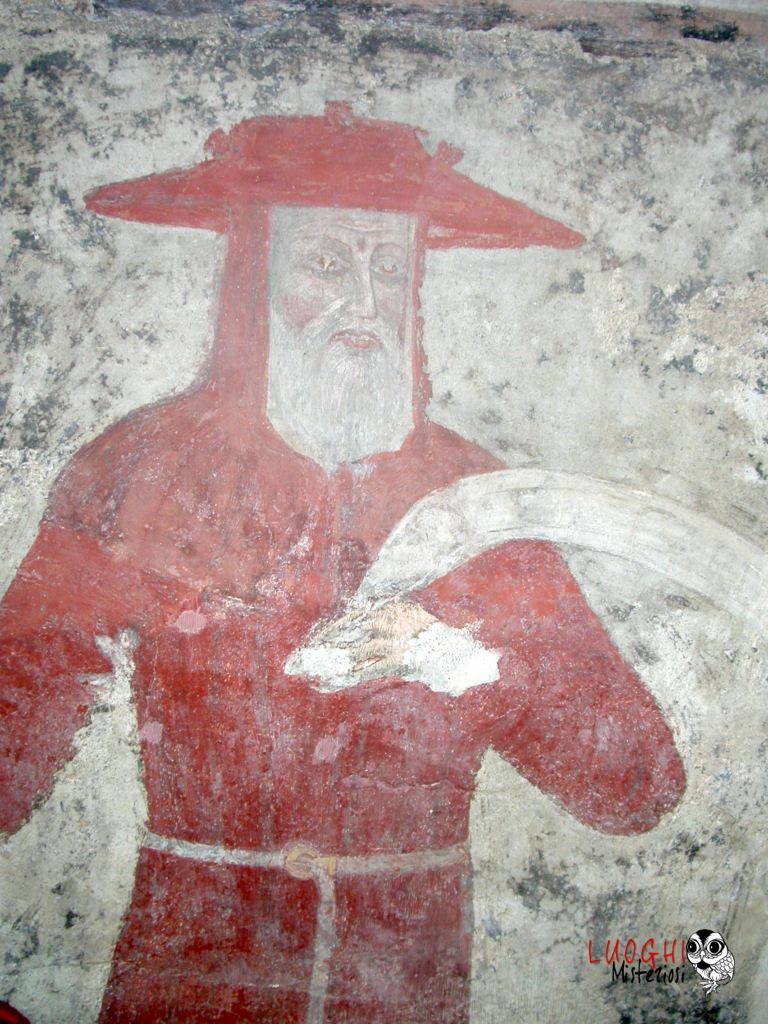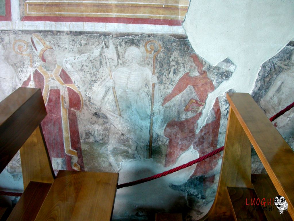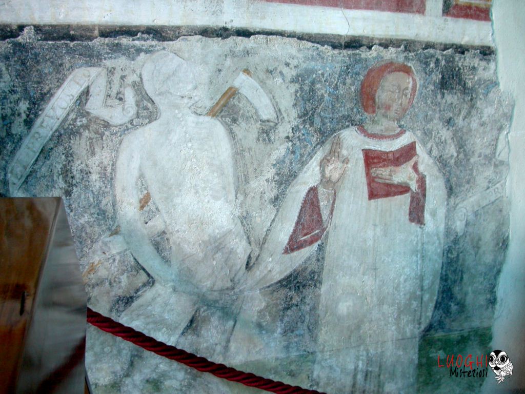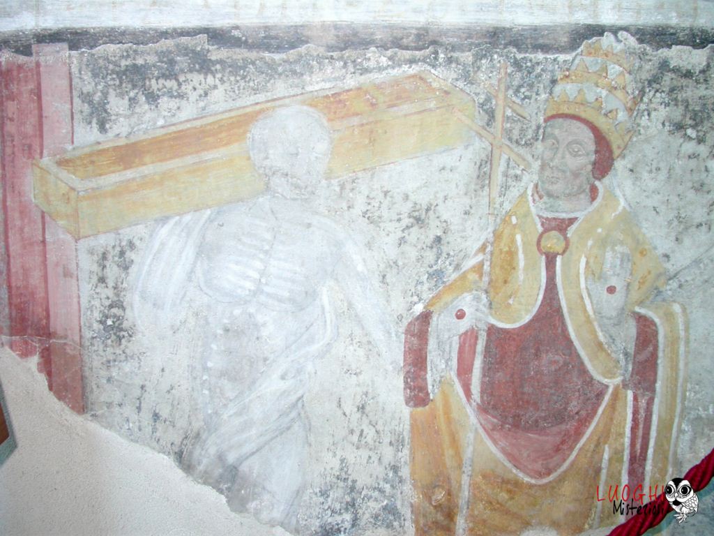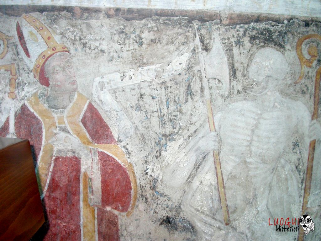Appena sotto i 7 affreschi è rappresentata una rara pittura di DANZA MACABRA, del ballo della morte con alcuni uomini dell’allora società, persone potenti, anche ecclesiastici, a riprova che la Morte non risparmia nessuno, neppure colui che ai nostri occhi ci può apparire “immortale”.