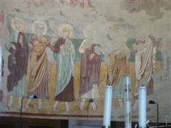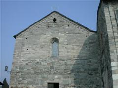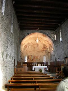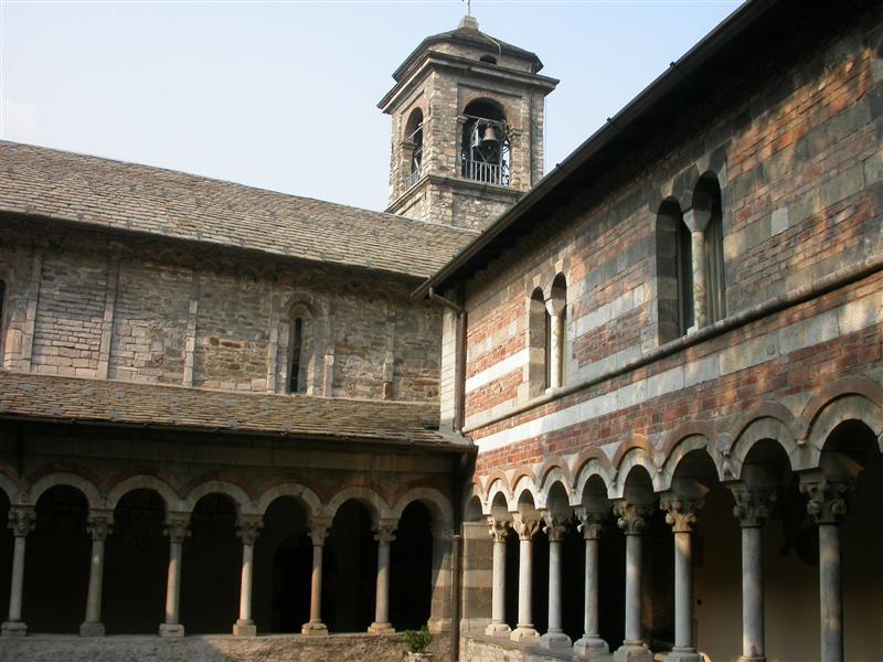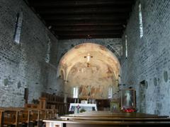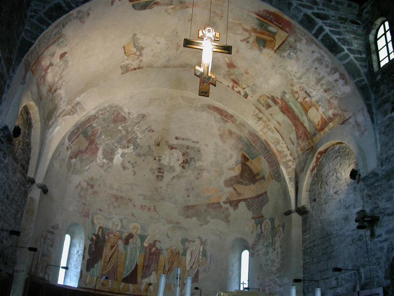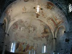 La Chiesa di S. Nicolao è dell’XI secolo, ma sostituisce una precedente del VII secolo fondata dai monaci Cluniacensi nel Medioevo, a protezione di quella zona che era facile preda di banditi e pirati. Cadde successivamente in decadenza, ma venne solo da pochi anni restaurata e rivalutata. Ciò che ha colpito come al solito gli studiosi è il fatto che i ricchi quanto splendidi affreschi dell’interno siano stati completamente coperti da uno strato di stucco bianco, come accadeva un tempo, che ha distrutto tantissime opere d’arte italiane. Infatti gli affreschi dell’abside del XII secolo, sono ahimè quasi completamente perduti. Essi raffigurano un’immensa glorificazione di Cristo in stile bizantino, mentre ancora di salvano quelli del chiostro, sempre in stile romanico-bizantino e sempre dello stesso periodo. Nell’abside Gesù è inscritto in una mandorla e, ascendendo al cielo, giudica l’umanità con il Libro della Verità aperto; accanto a lui i 4 evangelisti visti ancora in forma apocalittica di animali.