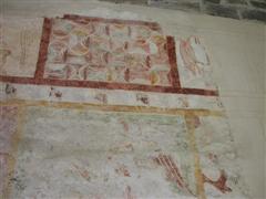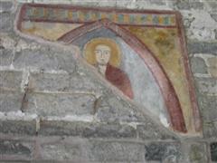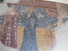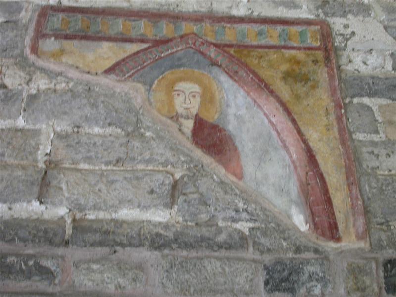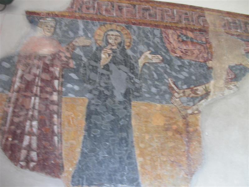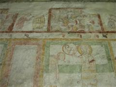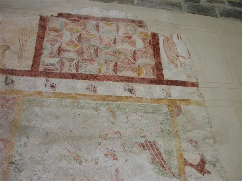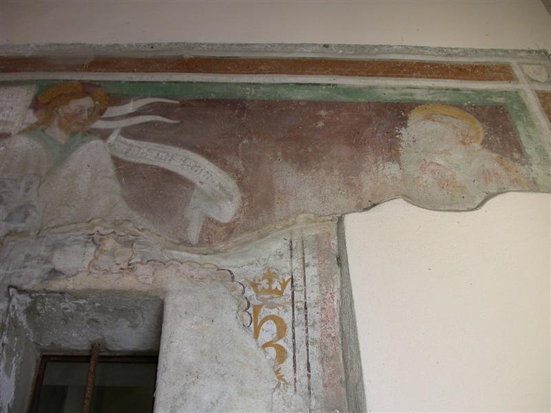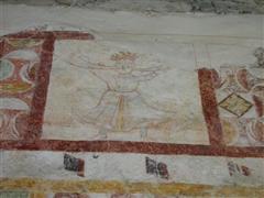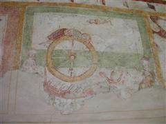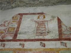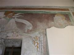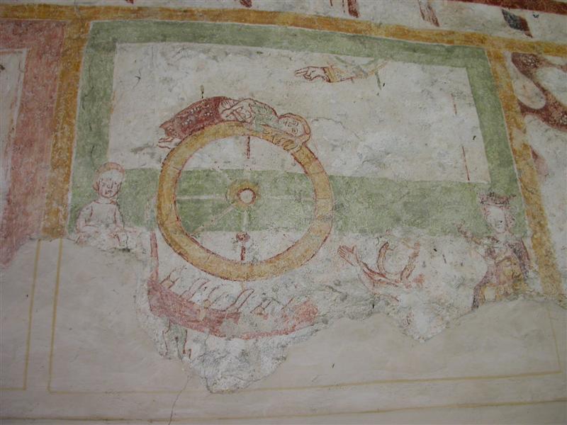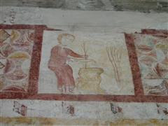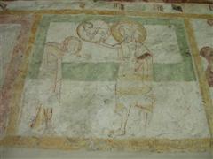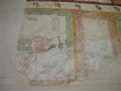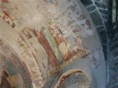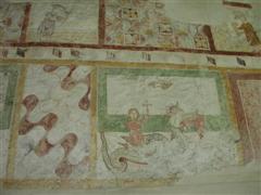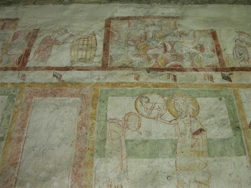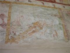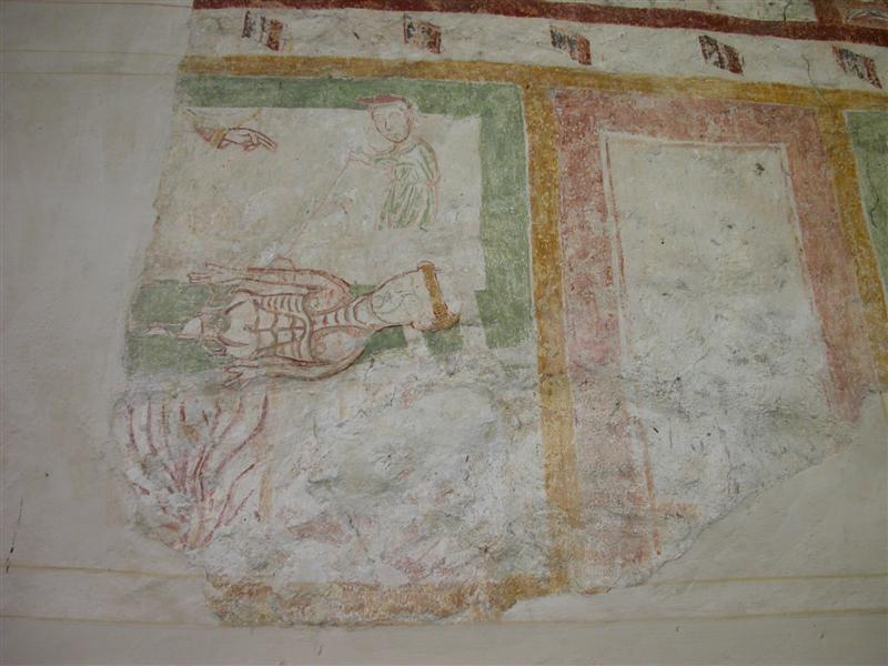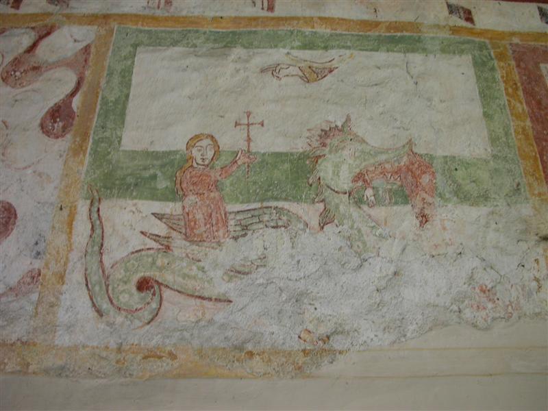 Alcuni altri affreschi, a parte le scene contadine, sono curiosi e di difficile interpretazione. Vi è per esempio un personaggio, probabilmente S. Giovanni battista che porge la testa a un S. Giovanni Evangelista, o forse a se stesso… poi vi è una santa Margherita che cavalca un drago che tiene stretto nelle fauci una fanciulla, liberandola o punendo l’ennesima figura femminile? Vi è poi santa Caterina d’Alessandria martirizzata sulla ruota (e non trionfante con la ruota distrutta come spesso si mostra); San Lorenzo bruciato per metà da una graticola. Inquietanti raffigurazioni.