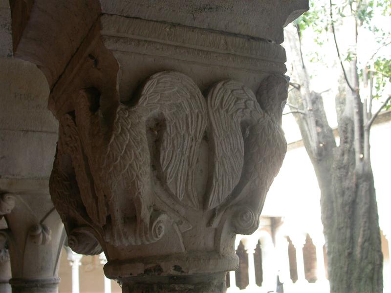 Al lato nord è possibile trovare figure di serpenti con teste di donna, monito per i monaci a non farsi sedurre dalla donna e dal serpente chiara simbologia del peccato originale, non a caso legato anche al giardino del chiostro.