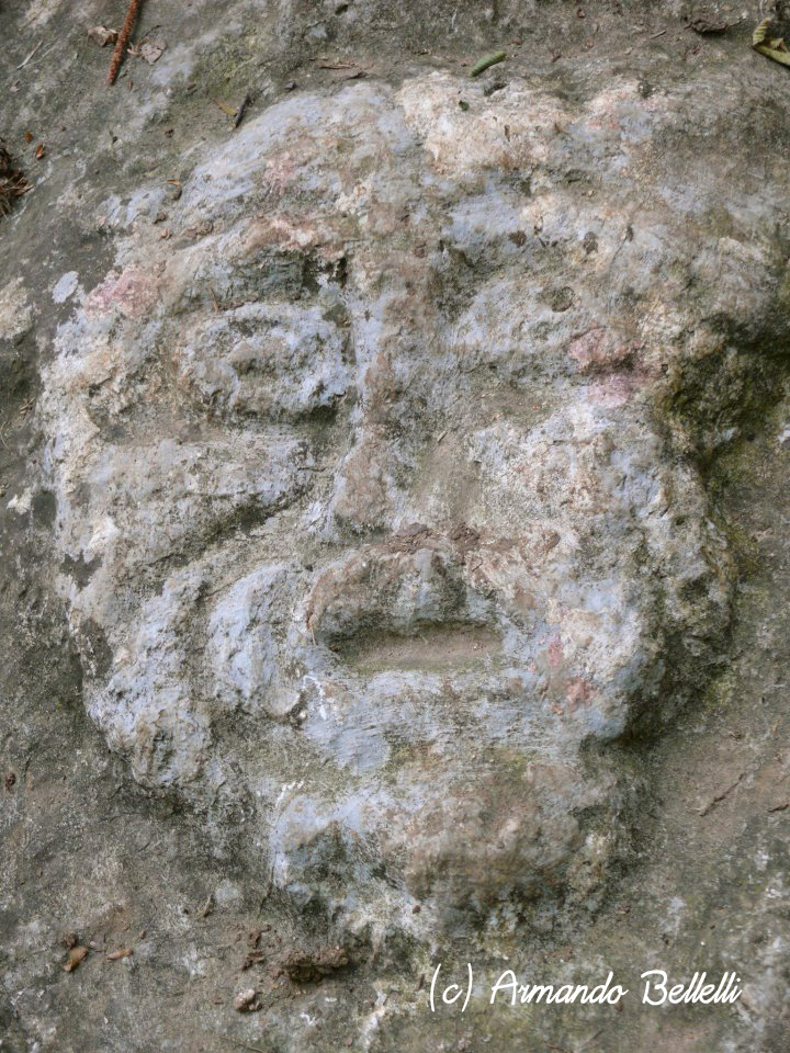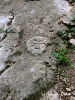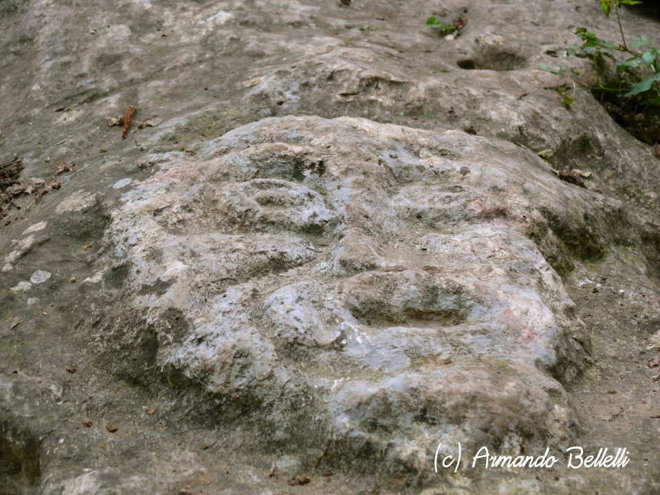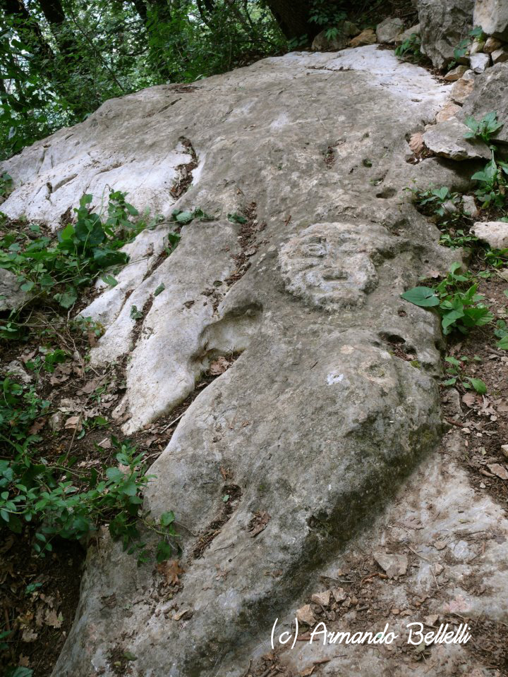 Ben scolpito nella roccia, e sicuramente da mano abile ed esperta, appare immobile un volto in parte umano in parte ferino o bestiale.