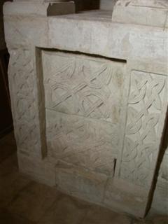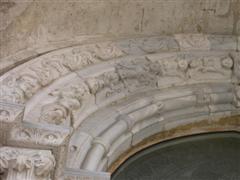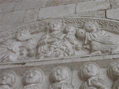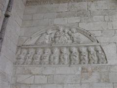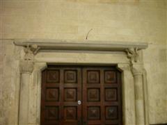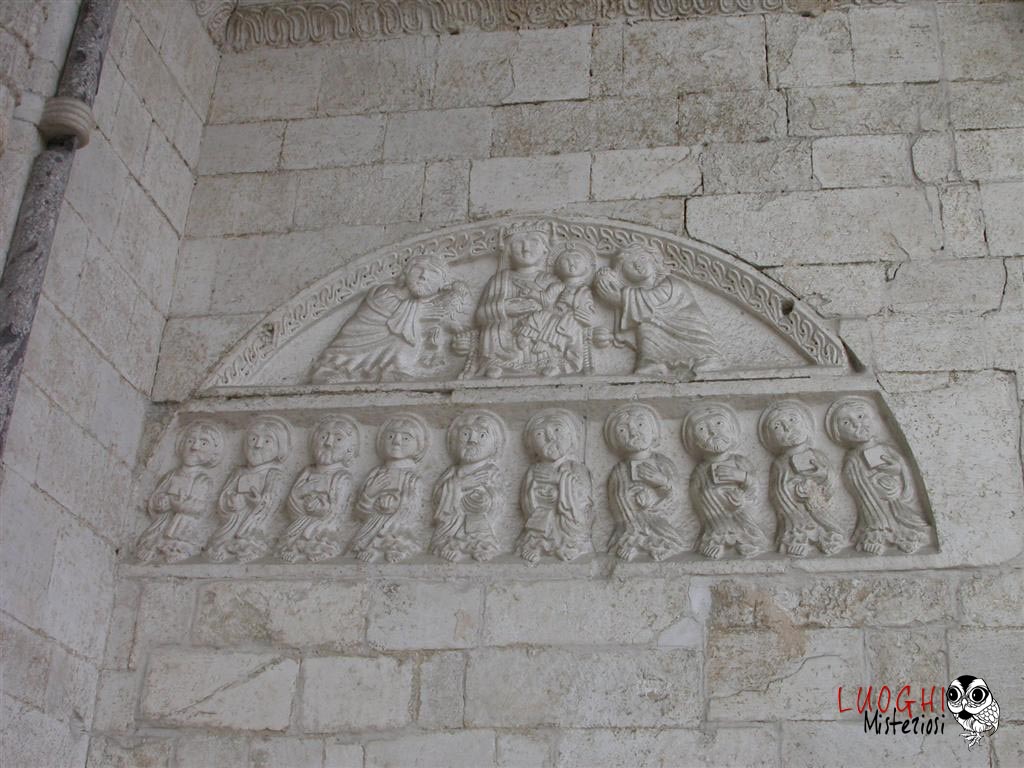 Molto più elaborato del portale di destra, presenta una decorazione complessa. Al centro troviamo un Agnus Dei posizionato nella chiave d’arco con ai suoi lati angeli con turiboli. Sul lato sinistro c’è la figura di S.Pietro con in mano una grossa chiave insieme a due re con calici pieni di offerte