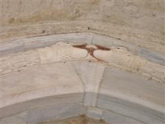 Vi sono due lunghissimi serpenti fronteggiati lungo tutto il portale, formando un vertice gotico, mentre le code terminano in una spirale, quasi a voler in qualche modo ricordare un antico Uro buro (il serpente che si mangia la coda simbolo di infinito) attraverso il quale si accede all’infinito. E’ unico trovare un bassorilievo come questo alla porta di una chiesa.