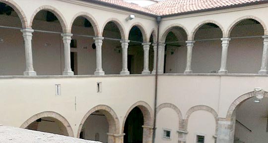 Il cortile è il luogo degno di interesse in quanto raccoglie reperti e iscrizioni antiche. Molto particolare è l’incisione di una triplice cinta su uno dei muretti di un piano elevato.