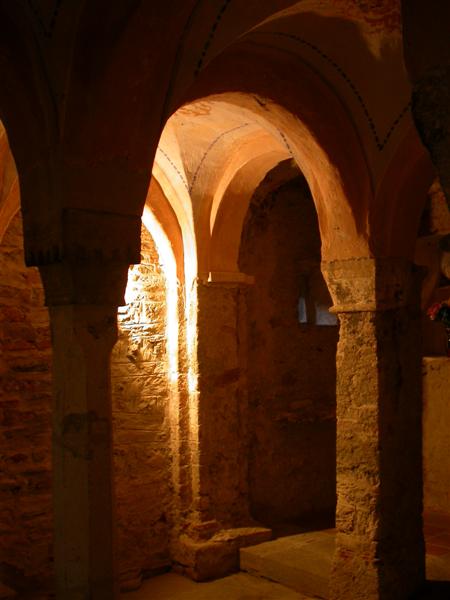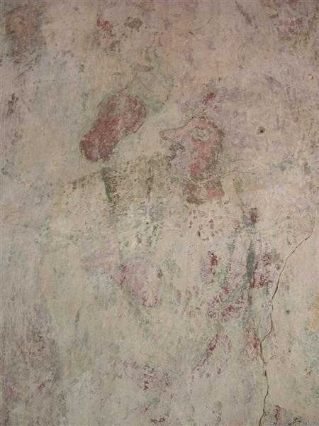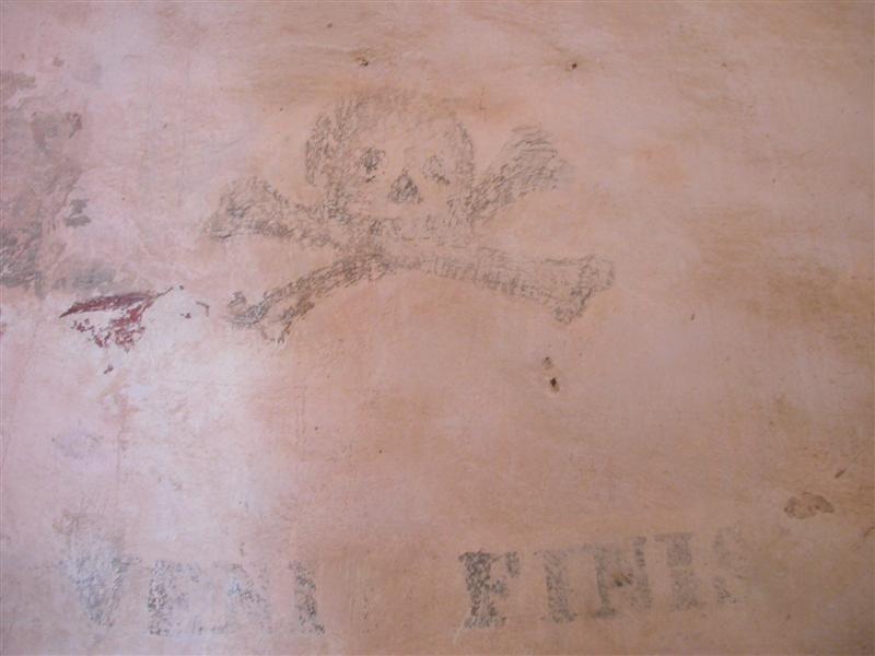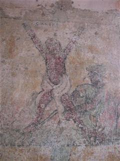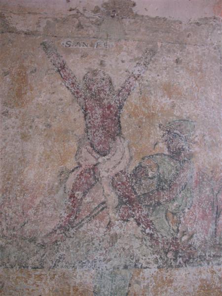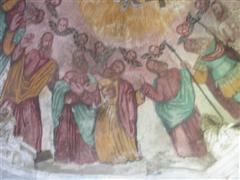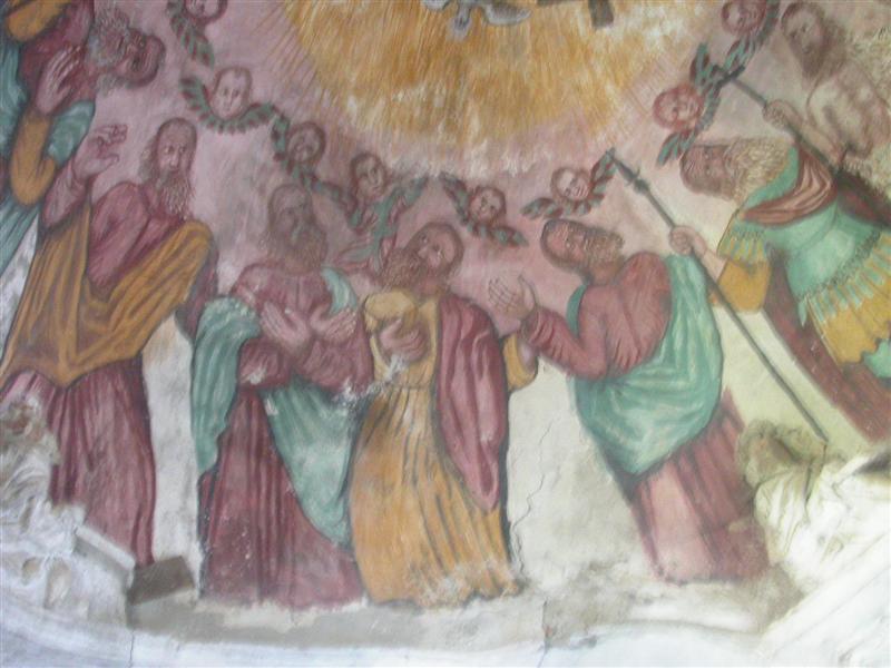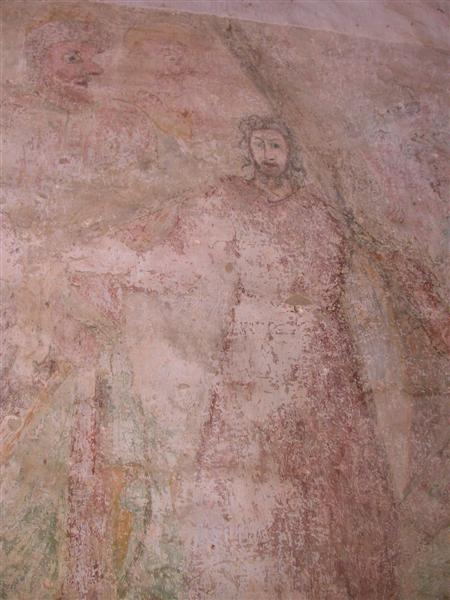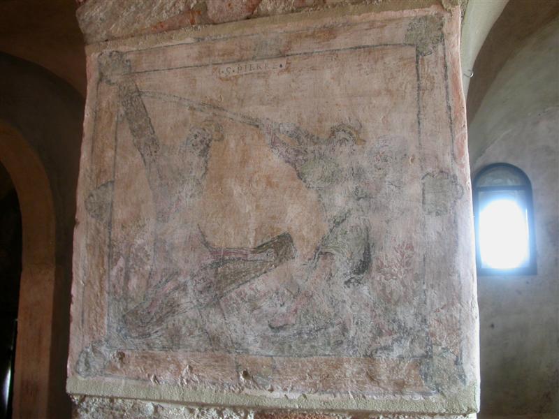 Si presume fosse realizzata per contrastare la pittura, ormai oggi quasi scomparsa, di una “danza macabra” all’esterno della Chiesa. Ennesimo esempio di costruzione cristiana a coprire quella pagana, con una pietra sopra un’altra pietra, e un affresco a “coprire” un altro affresco… se al di fuori dell’edificio balla la morte, all’interno balla la vita verso Dio.