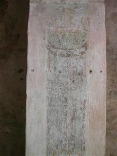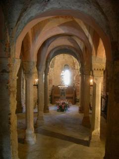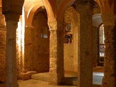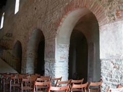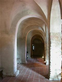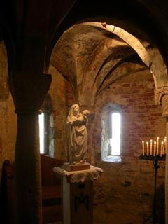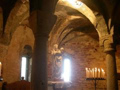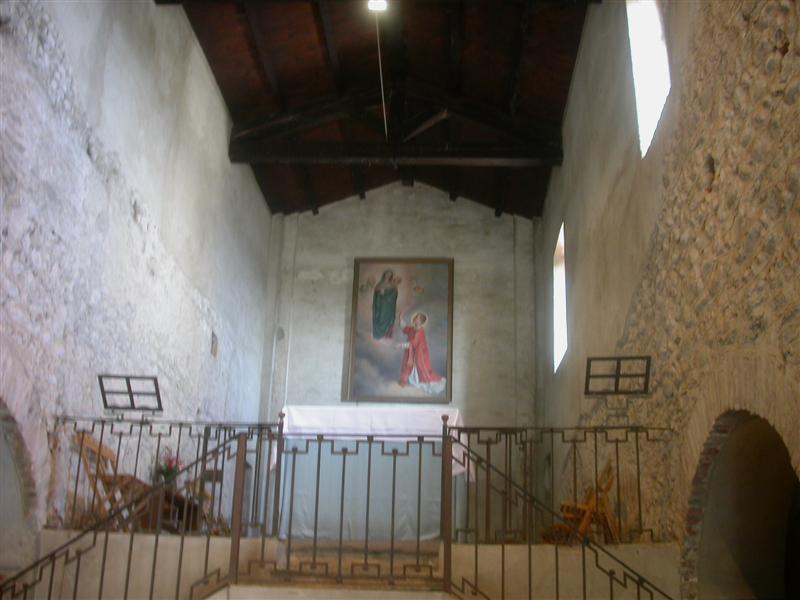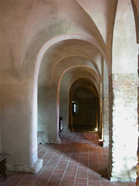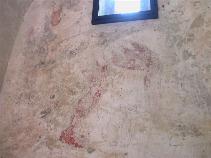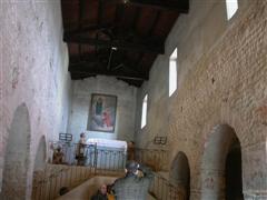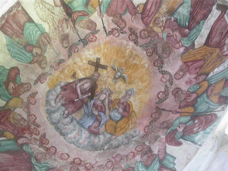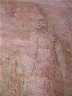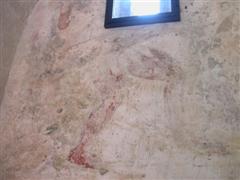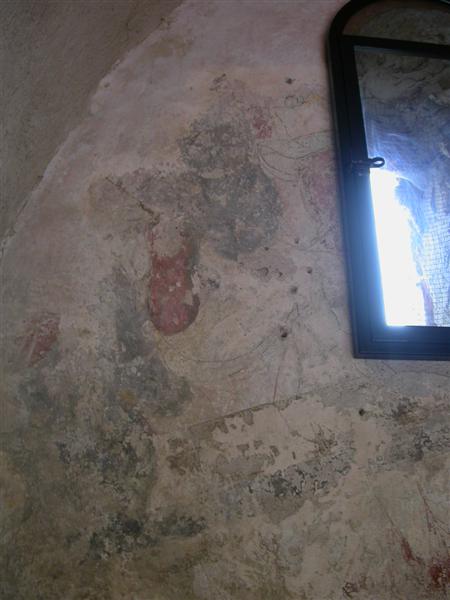 Sulle pareti vi sono affreschi quasi totalmente scomparsi, ma è possibile ancora osservarne uno ben conservato in una cappelletta molto stretta, dove vi è rappresentata una sorta di “danza sacra” di beati attorno a Dio.