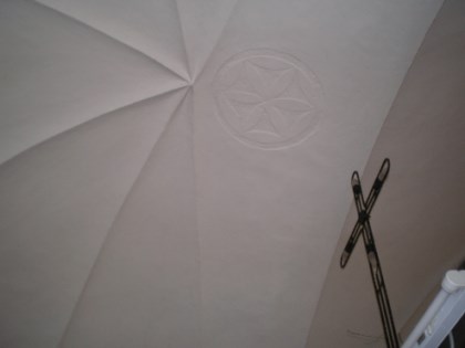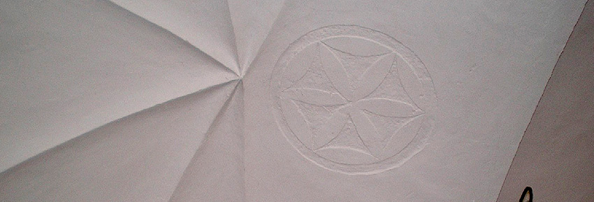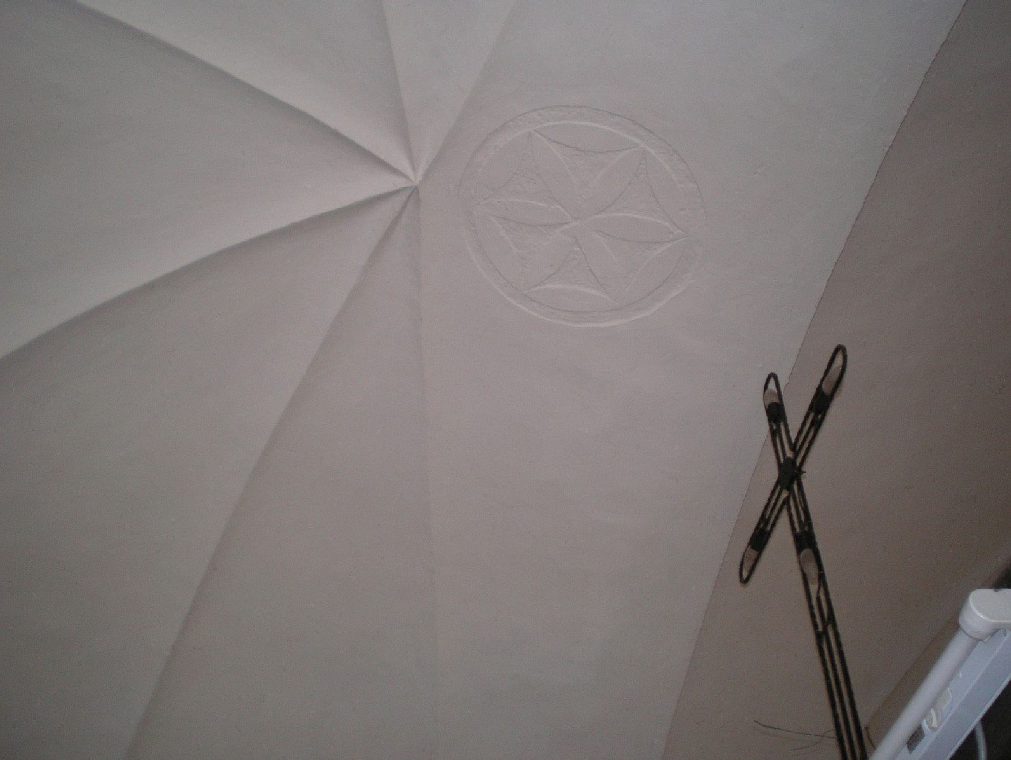 Prima di indagare il mistero di questo disegno, il suo significato simbolico e la provenienza, occorre descrivere altri elementi meritevoli di studi approfonditi: e in particolare,il “tondo” a disegno floreale situato sul soffitto sopra l’altare, proprio accanto al punto di convergenza dei 5 spicchi di cui è composto l’emiabside posteriore.