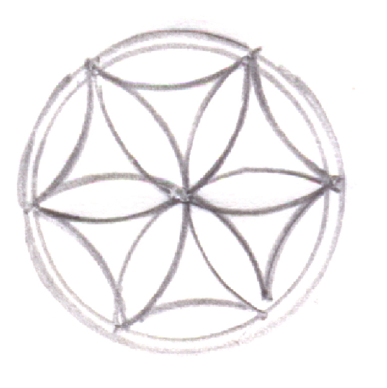 Tale simbolo è composto da 6 petali interni uniti da 6 esterni circoscritti in un cerchio. Nelle culture popolari veniva raffigurato a scopo scaramantico per tener lontani gli spiriti maligni, ma se arretriamo di un paio di millenni lo ritroviamo nell’arte celtica e ancor più anticamente in quella assiro-iraniana come elemento augurale di vita eterna. In un muro del secondo tempio di Abydos in Egitto sono incisi sulla roccia granitica simboli geometrici definiti “Il seme della vita” o “Fiore della vita” a testimonianza dell’antica religione egiziana; alcuni studiosi ritengono che tali raffigurazioni risalgano addirittura al 4000 A.C. Il nostro “tondo” richiama proprio quell’antico graffito.