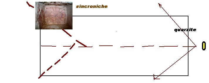 Come si evince dal disegno, c’è una sincronica che attraversa tutta la chiesa nel suo asse maggiore della lunghezza, rimbalza su un masso con quarzite che si trova di fronte al portale e si divide in altre 2 sincroniche..