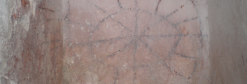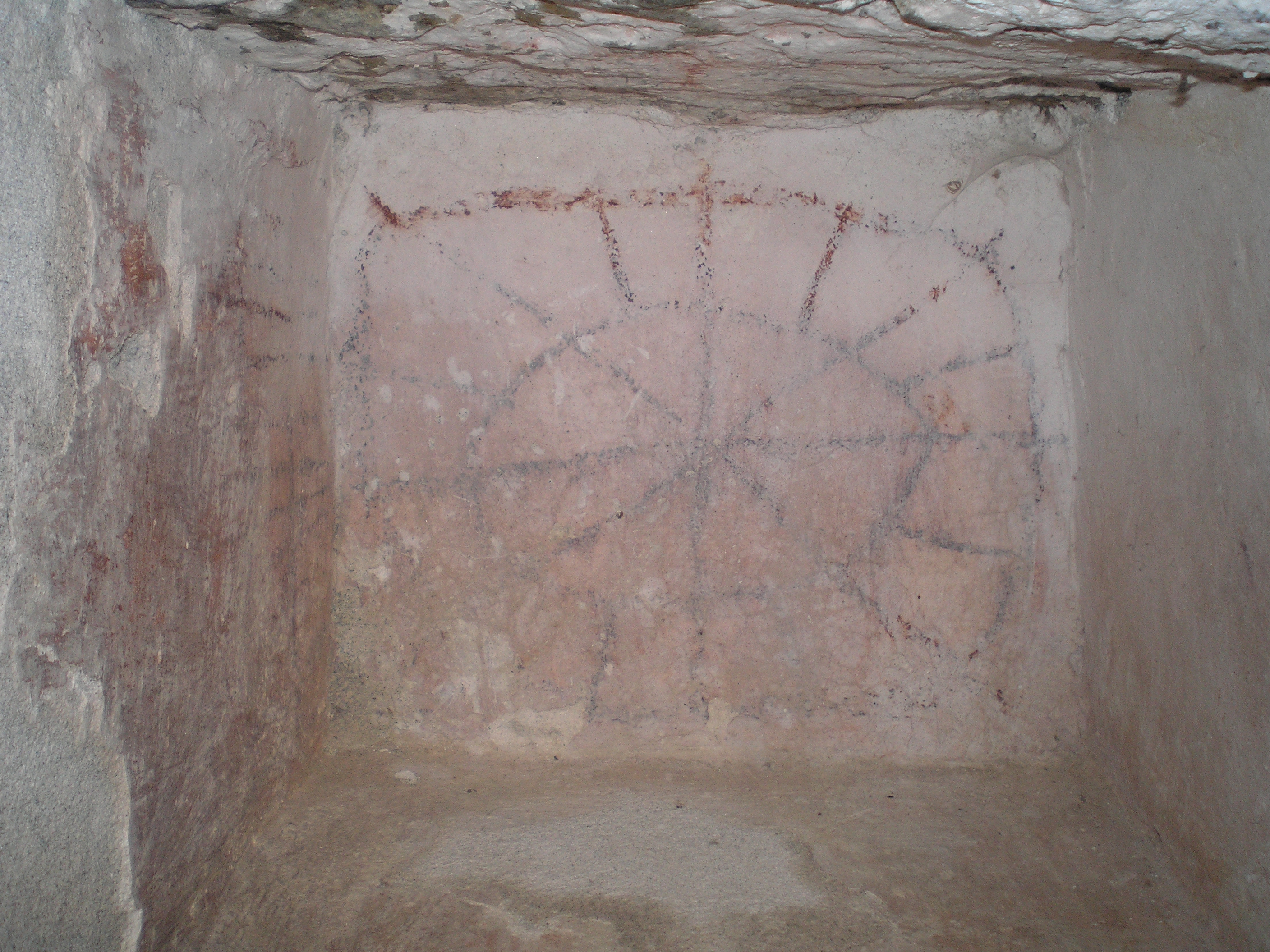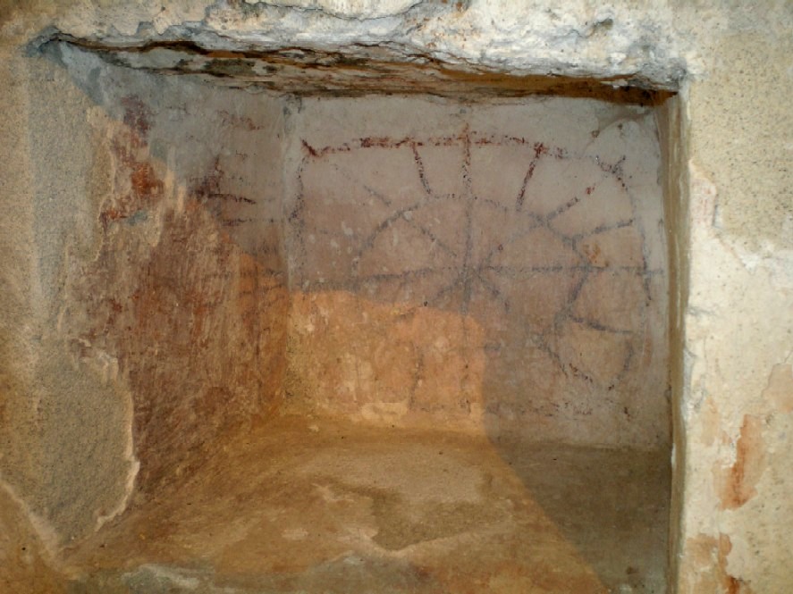 E, proprio durante i lavori di restauro delle pitture murali, venne scoperta, celata dietro una parete, una nicchia al cui interno è raffigurato un particolare pittogramma: una doppia ruota raggiata formata rispettivamente da 8 e 16 raggi che si uniscono ad un reticolo laterale.
