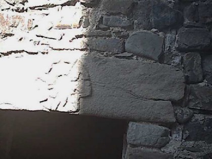 Dal disegno e dalla parte opposta partono altre 2 sincroniche che si incontrano poco sopra un altare di pietra (riportato in tempi moderni dagli Alpini che hanno contribuito al restauro della chiesa (1997)). Secondo le nostre ipotesi, in questo punto di incrocio, arriva una linea cosmica dal cielo, che rispetto all’epoca medievale (gli affreschi son stati datati 1400 circa) ora è spostata oltre il punto di incrocio per effetto degli tzunami accaduti di recente: l’asse terrestre si è spostato di pochi gradi, ma sufficienti per spostare anche queste linee.
