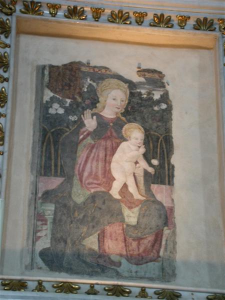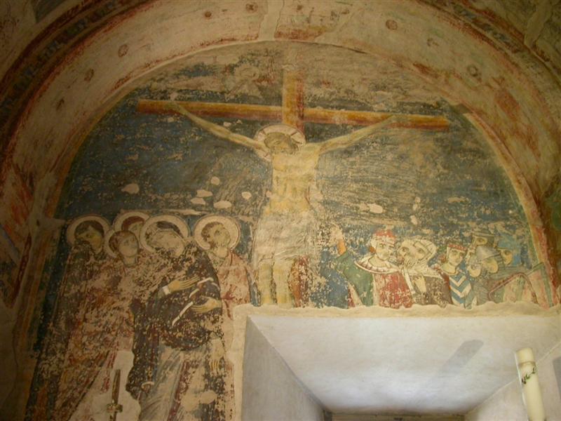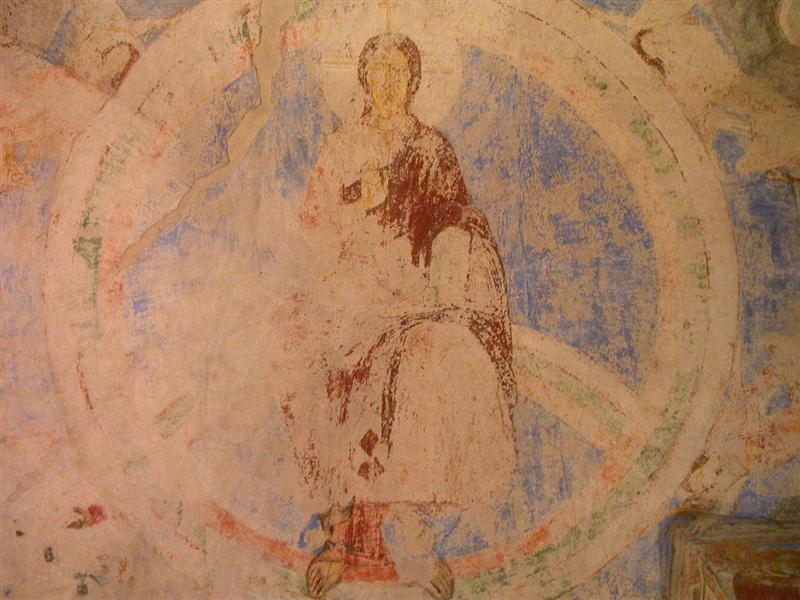 Di spicco è il Cristo pantocratore delimitato dalla mandorla con i piedi prima fuori e poi cancellati e ridisegnati all’interno della stessa. Nella volta prominenti le figure di due angeli con 6 ali, le cui superiori si incrociano, hanno in mano un labaro rettangolare e ai piedi 4 ruote, simbolo di grande velocità nel portare il volere di Dio.