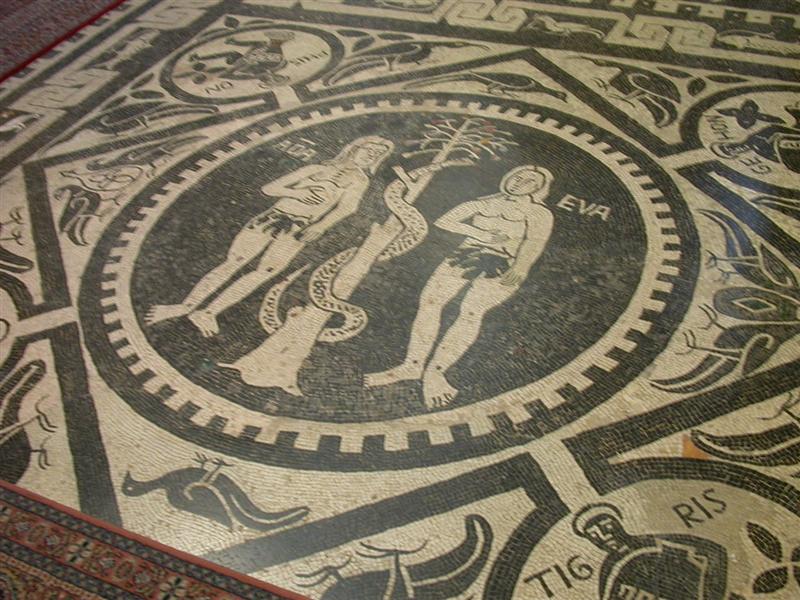 “Ada ed Eva” sono le uniche scritte, i due protagonisti tengono la mano destra sul cuore e la sinistra sulla foglia di fico. Ai 4 vertici del quadrato vi sono 4 uomini possenti che versano 4 anfore, essi sono metafora dei 4 fiumi che delimitano il paradiso e sono Phison, Gehon, Tigris ed Evfrates. Come cornici vi sono uccelli di varie specie e pesci di varie razze con l’amo in bocca, metafore dei cristiani che debbono cibarsi della sacra scrittura (non bellissima come immagine a mio parere dato che il pesce viene pescato con l’inganno che lo porta verso morte certa). Nel resto del mosaico abbiamo i 4 evangelisti ai cui lati spiccano i 4 venti. Al centro di una cornice fatta di grappoli d’uva da cui si cibano altri uccelli si vede l’agnello attorniato da 7 lampade e dalle 24 corone dentate, riferimento all’Apocalisse.