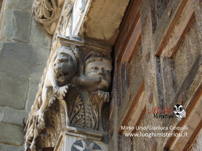 Sul muro esterno, a sinistra dell’entrata, è incisa una scritta enigmatica che ha suscitato da anni diverse interpretazioni da parte di innumerevoli studiosi. La stessa epigrafe si trova accanto all’entrata del duomo di Barga, all’esterno del battistero e di San Frediano a Pisa e su una cassa di piombo contenenete le reliquie di San Ponziano conservate a Lucca (originariamente a Roma).