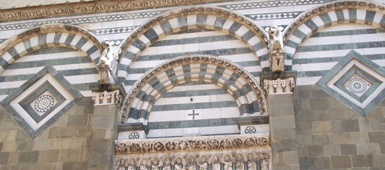 La splendida facciata in marmo bianco e verde, ospita sull’architrave centrale Gesù mentre dona le chiavi a San Pietro, con accanto la Vergine e agli apostoli, opera dell’Officina dei Guidi in attivo tra Pistoia e Lucca.
