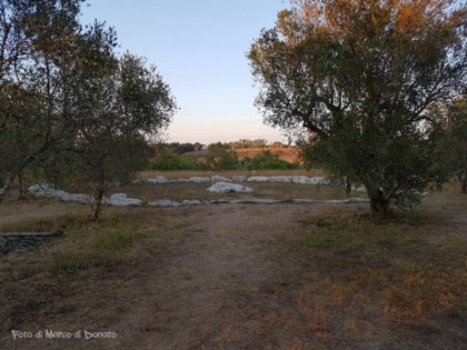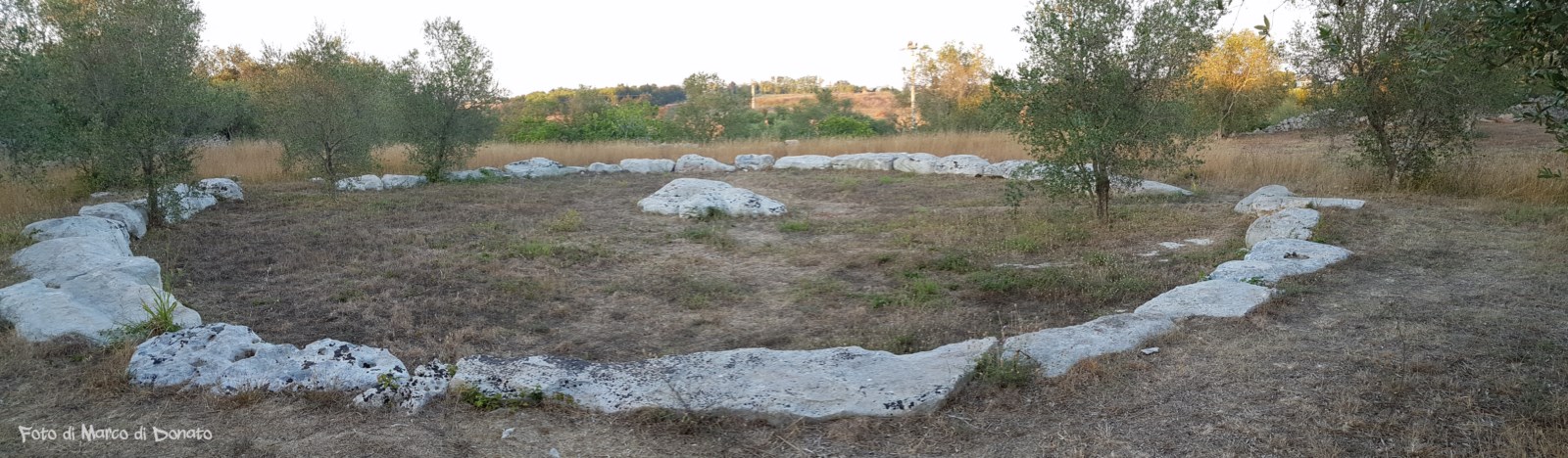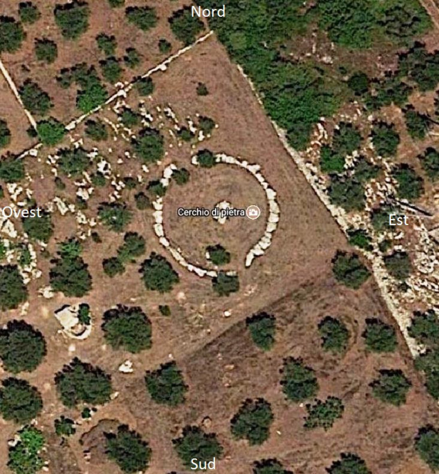 Proprio nei pressi del dolmen “Li Scusi” vi è un grande cerchio in pietra con due ingressi situati quasi in perfetta corrispondenza Nord-Sud, posti sull’asse della Stella Polare (che di fatto non punta perfettamente al Nord) al cui interno vi sono 3 pietre che formano un altro piccolo cerchio.