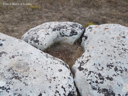 Nella parte superiore di questo monumento, a differenza di quello che vediamo in altri dolmen, dove troviamo un piccolo canale posto sulla lastra centrale e probabilmente utilizzato per far scorrere il sangue dell’animale sgozzato, qui troviamo un foro ove, verosimilmente, veniva fatta cadere la testa dell’animale decapitato.